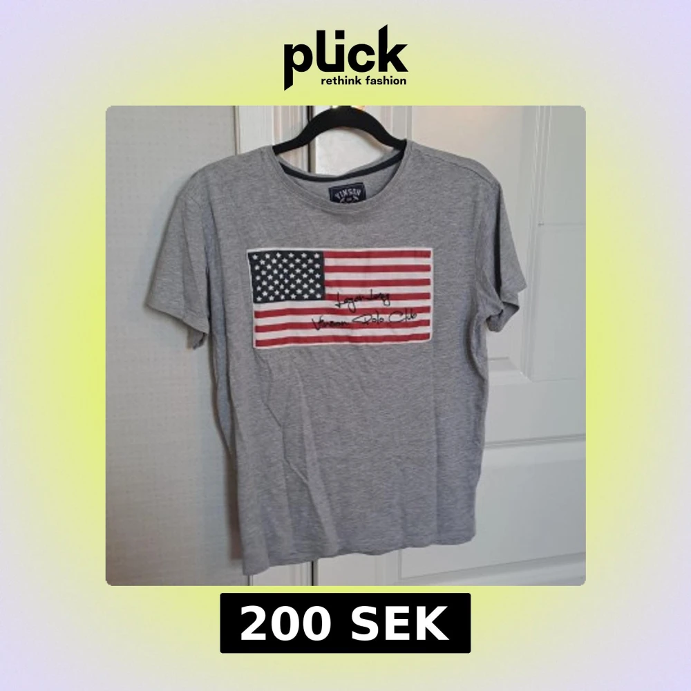 Säljer en grå t-shirt från Vinson Polo Club med ett tryck av den amerikanska flaggan och texten 'Legendary Vinson Polo Club'. Perfekt för en avslappnad stil. Kan sänka priset vid snabbt köp!