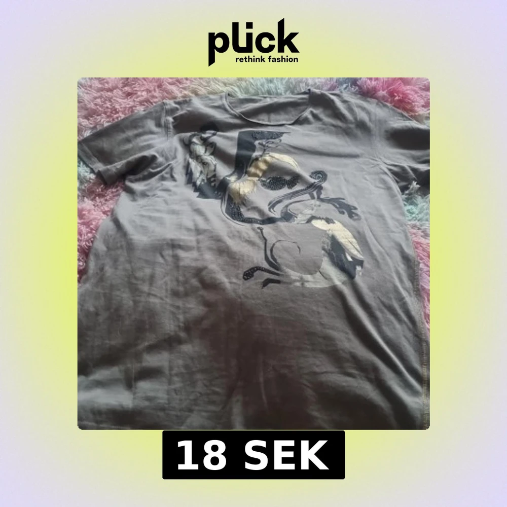 Säljer en grå t-shirt från Festive med korta ärmar och rund hals. Framsidan har ett konstnärligt tryck i svart och guld med små svarta pärlor som detalj. Materialet känns mjukt och är troligen bomull. Perfekt för dig som gillar unika prints och coola detaljer.