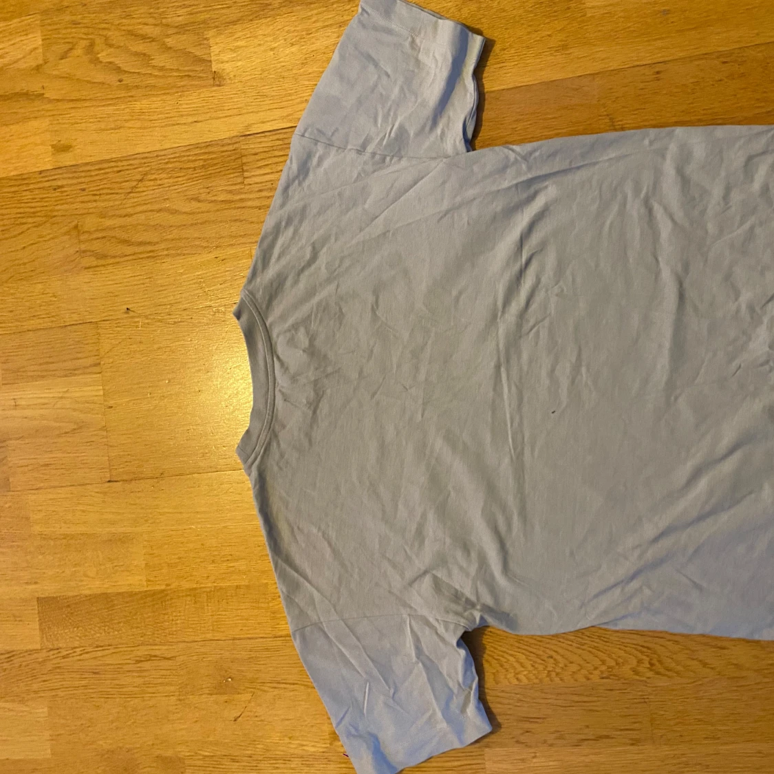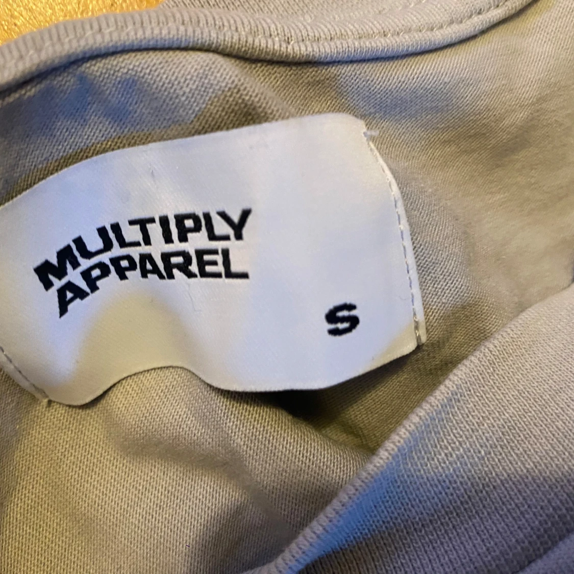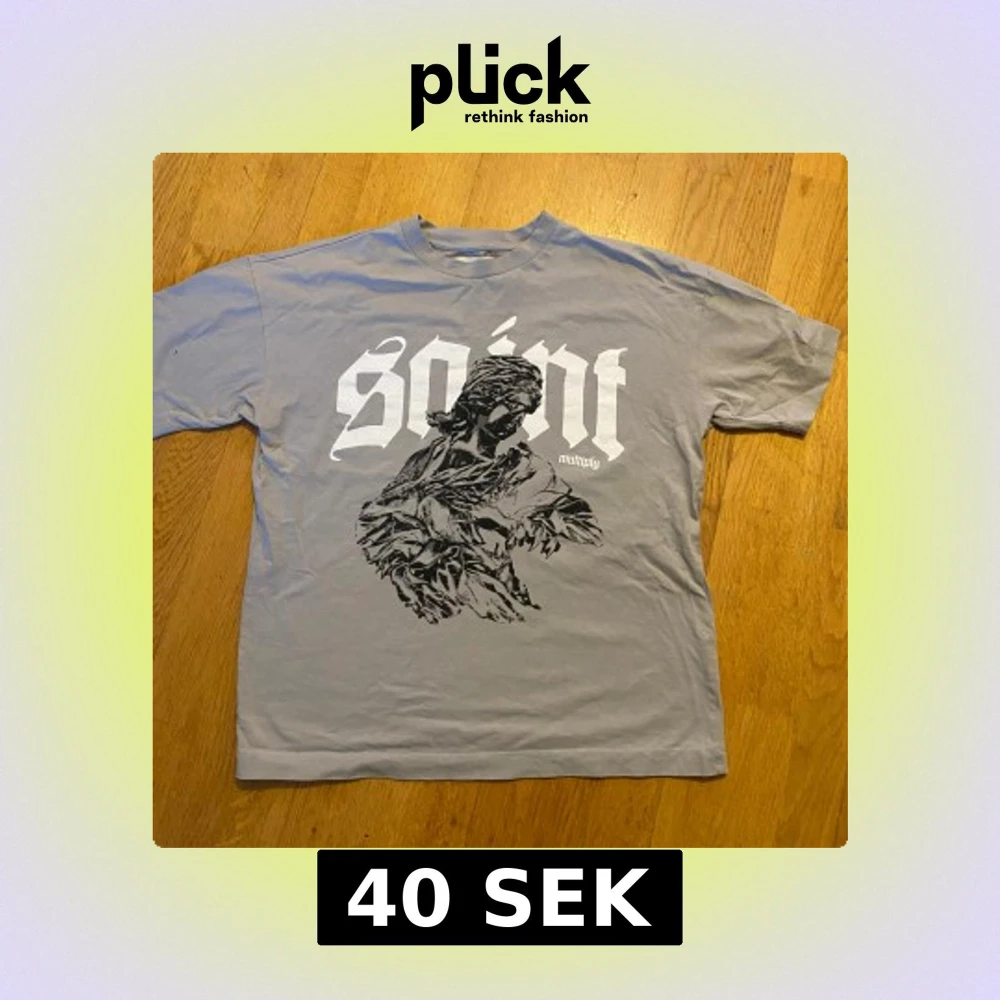 Grå t-shirt från Multiply Apparel i storlek S med stor vit och svart print framtill. Trycket har ett konstnärligt motiv och texten 'saint' i gotisk stil. T-shirten har rund hals och korta ärmar, tillverkad i mjuk bomull. Perfekt för dig som gillar streetwear och grafiska prints. Den har en liten fläck men syns knappt.