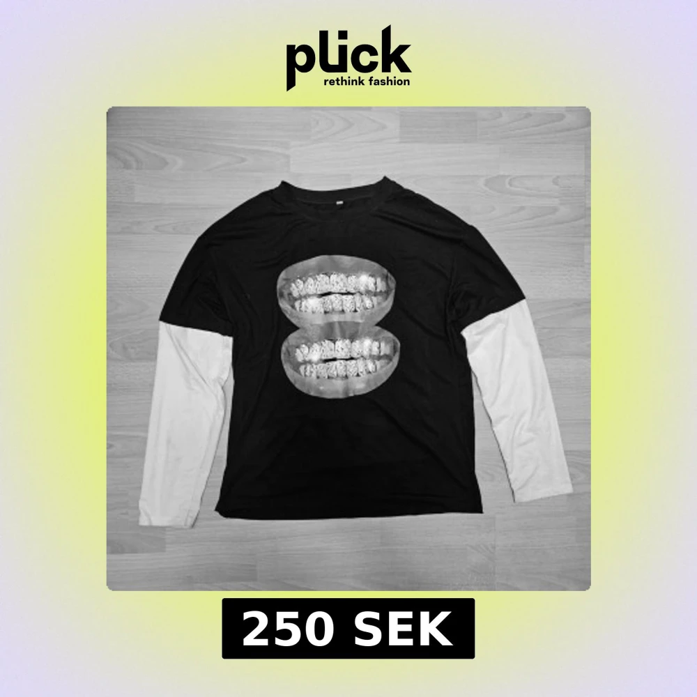 Unik svart t-shirt med vita långa ärmar i lager-på-lager-stil och ett stort tryck av två uppsättningar tänder på bröstet. T-shirten har en avslappnad passform och cool kontrast mellan svart och vitt. Perfekt för dig som vill sticka ut.