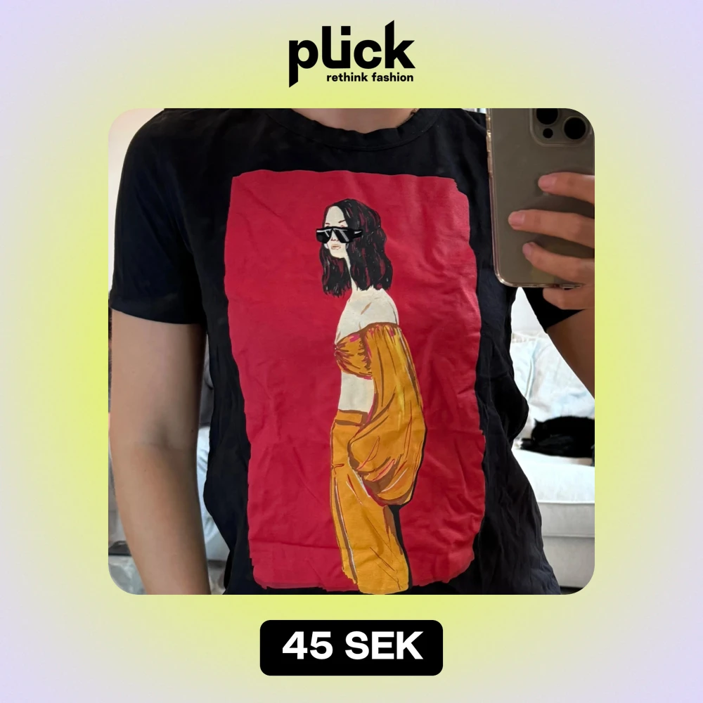 Cool svart t-shirt från Zara med ett färgglatt tryck av en kvinna i solglasögon. Perfekt för en avslappnad stil med en touch av konstnärlig flair. T-shirten är kortärmad och gjord i mjukt material för bekväm användning.