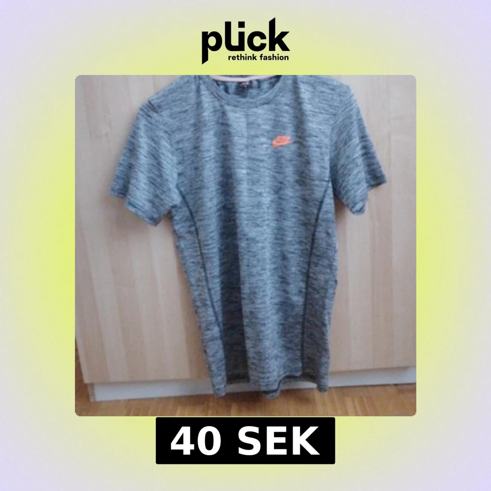 Säljer en gråmelerad t-shirt från Nike med korta ärmar och en orange logga på bröstet. Perfekt för träning eller vardagsbruk. Materialet är mjukt och bekvämt.