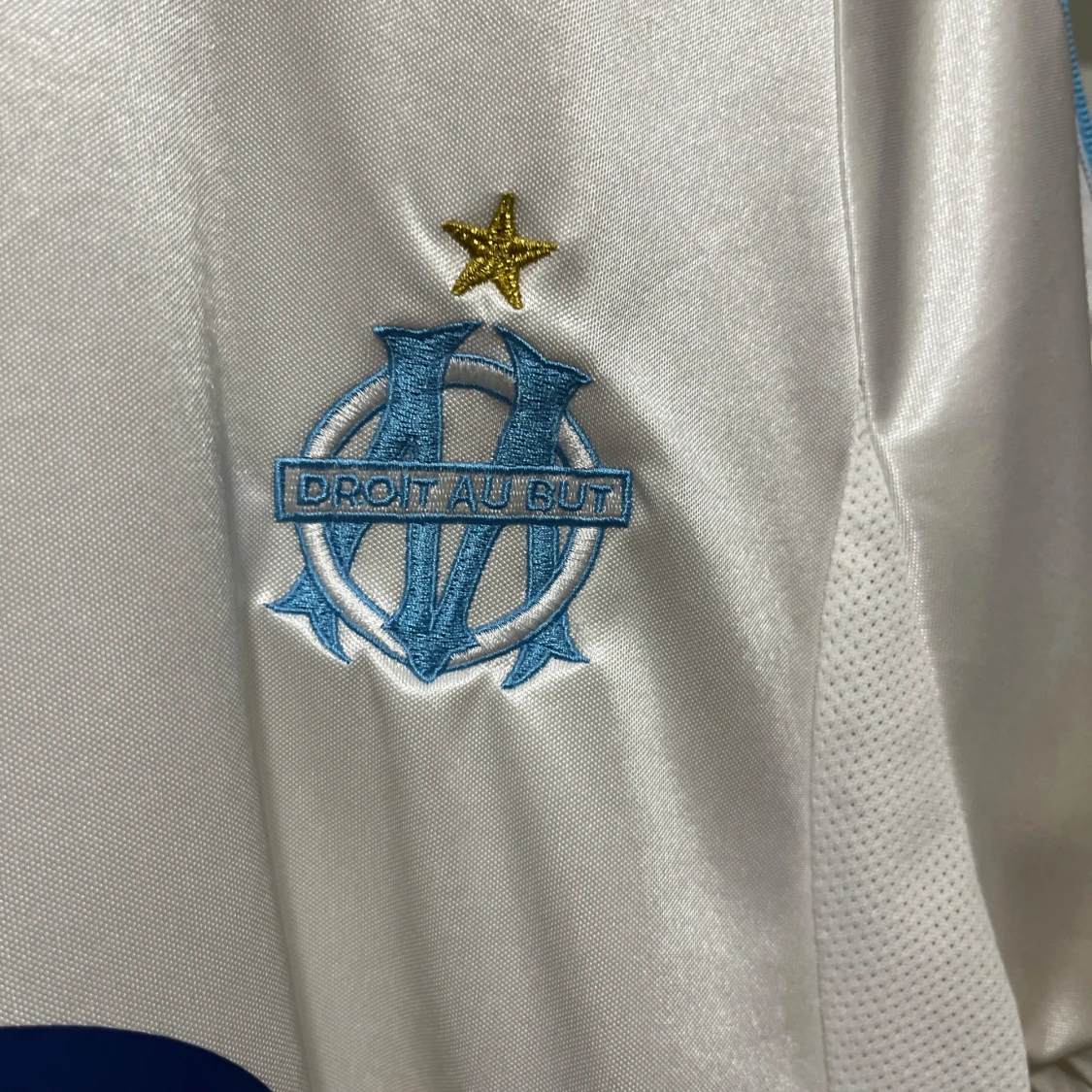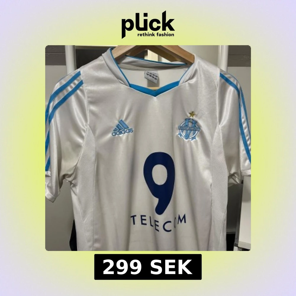 Säljer en vit Olympique de Marseille fotbollströja från Adidas med ljusblå detaljer och klubbmärke broderat på bröstet. Tröjan har nummer 9 och TELECOM-tryck på framsidan samt klassiska Adidas-ränder på axlarna. Tillverkad i glansigt, ventilerande material.