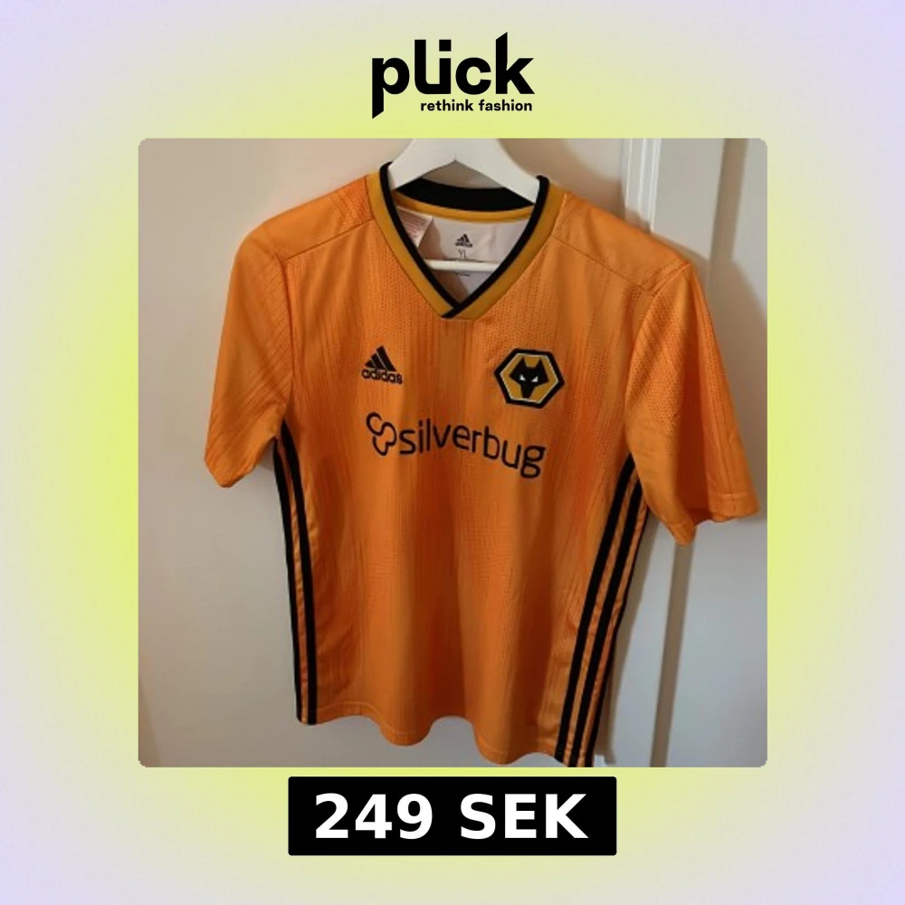 Snygg orange fotbollströja från Wolves med svart Adidas-logga och klubbmärke på bröstet. Tröjan är från 2018 och sponsortryck 'silverbug' på framsidan. Klassisk V-ringning med svart och gul kant.