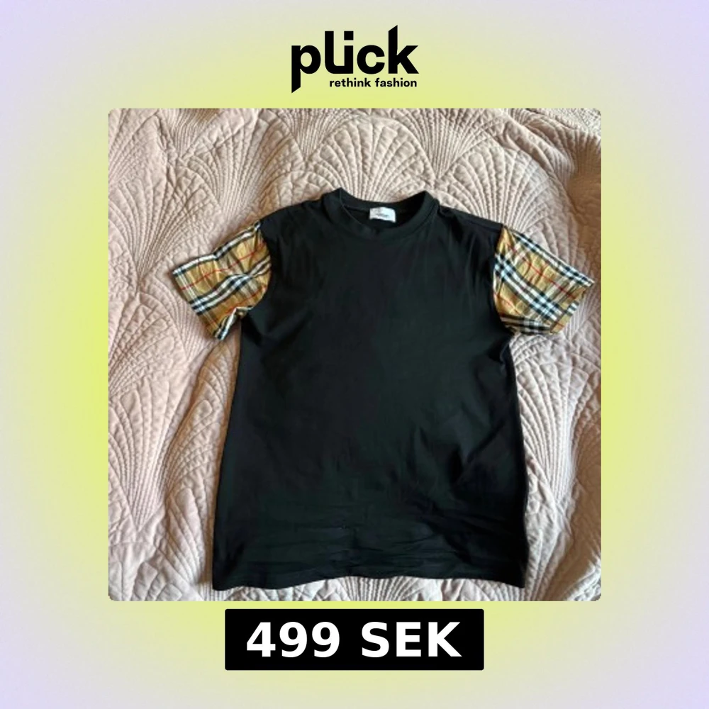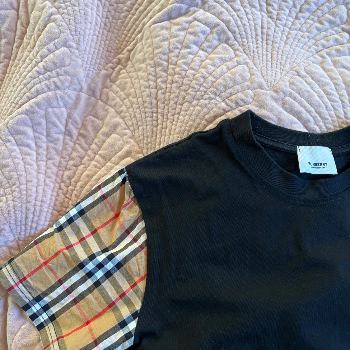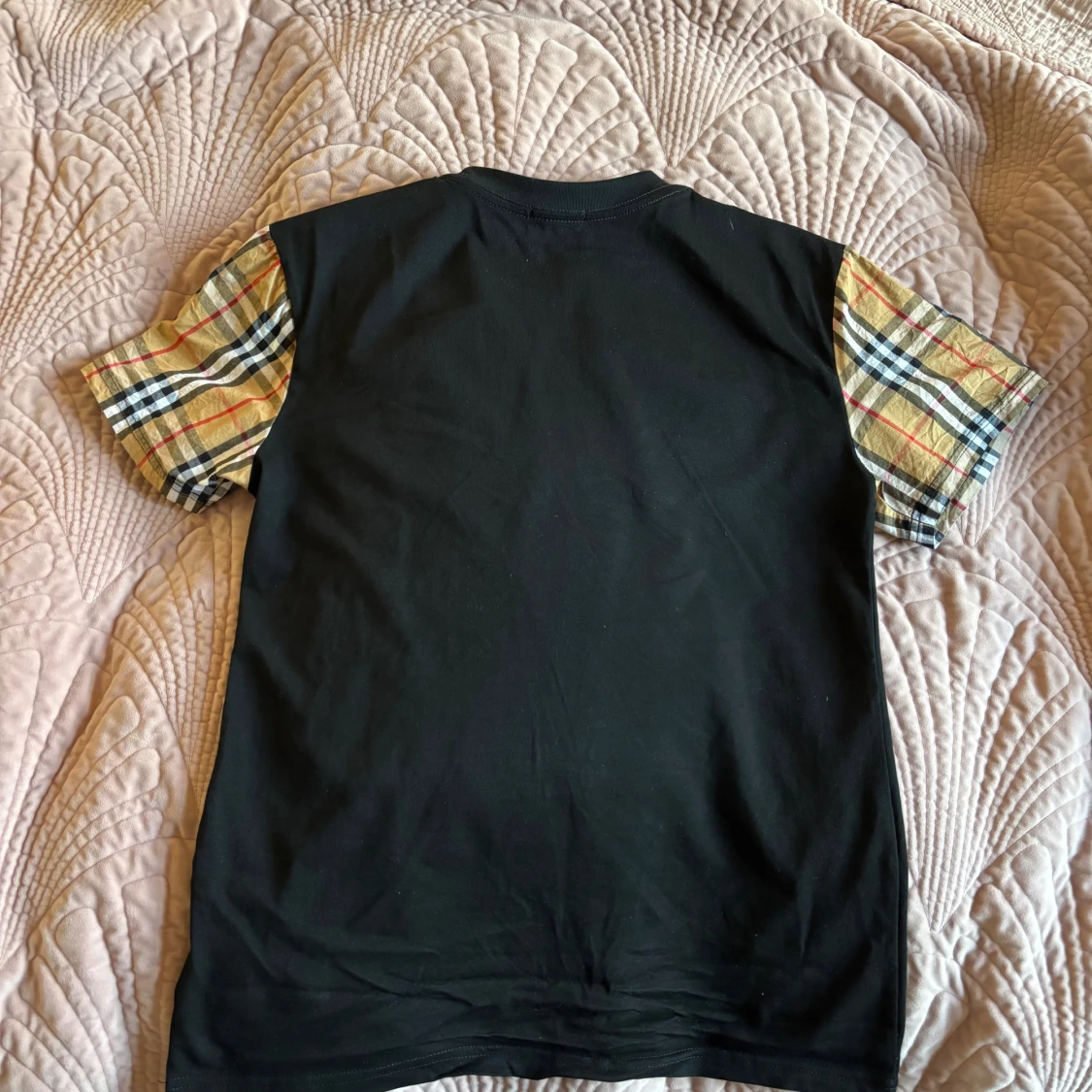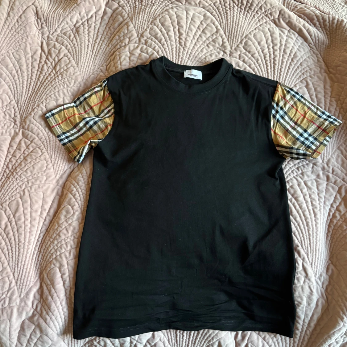 Svart t-shirt från Burberry med klassiska rutiga kortärmade ärmar i beige, svart, vitt och rött. T-shirten har rund halsringning och är gjord i mjuk bomull. Perfekt för dig som vill ha en stilren look med en twist.