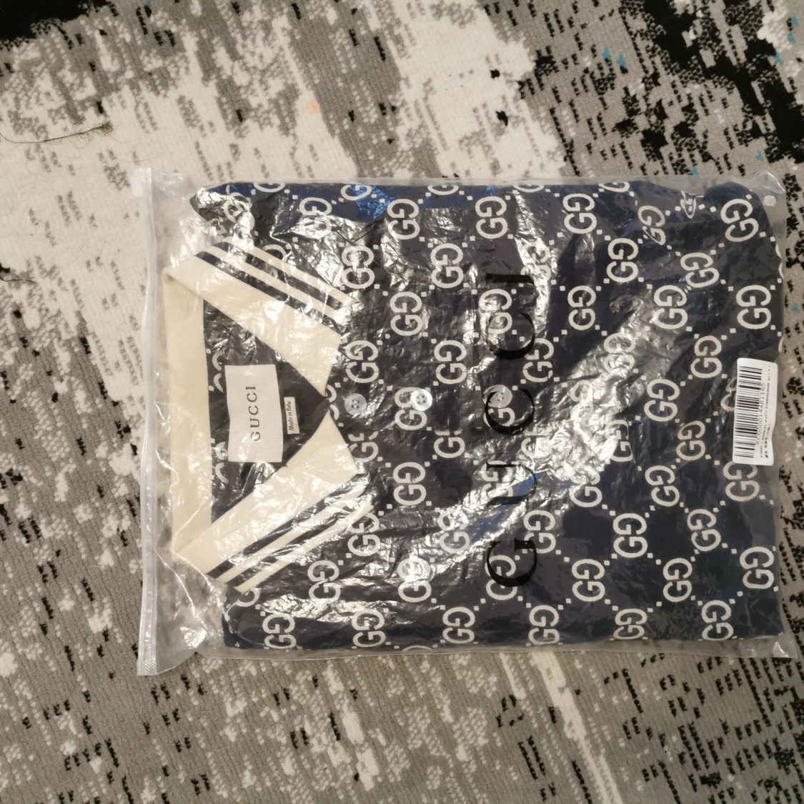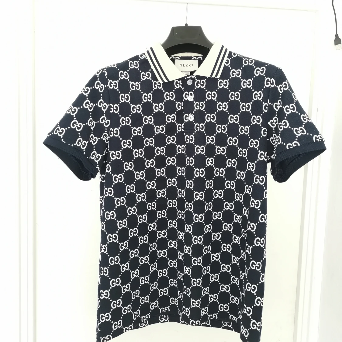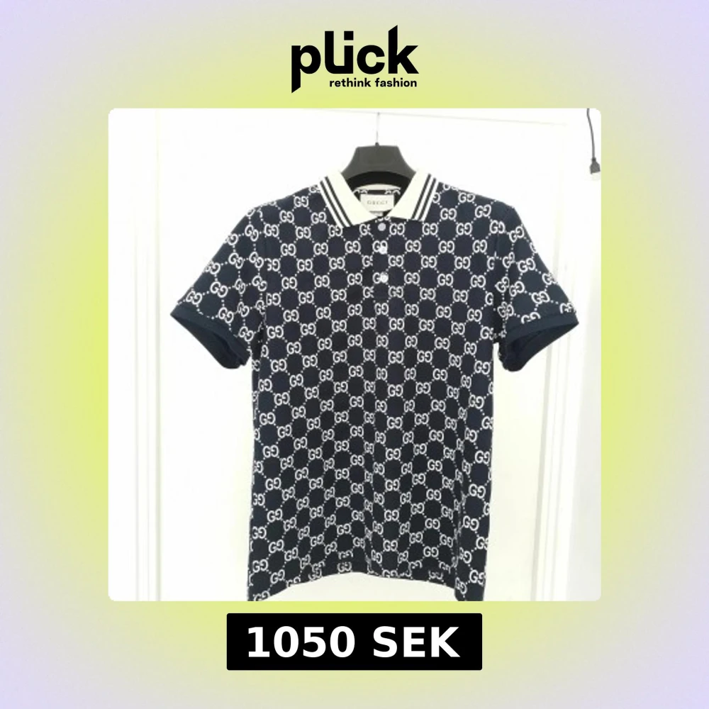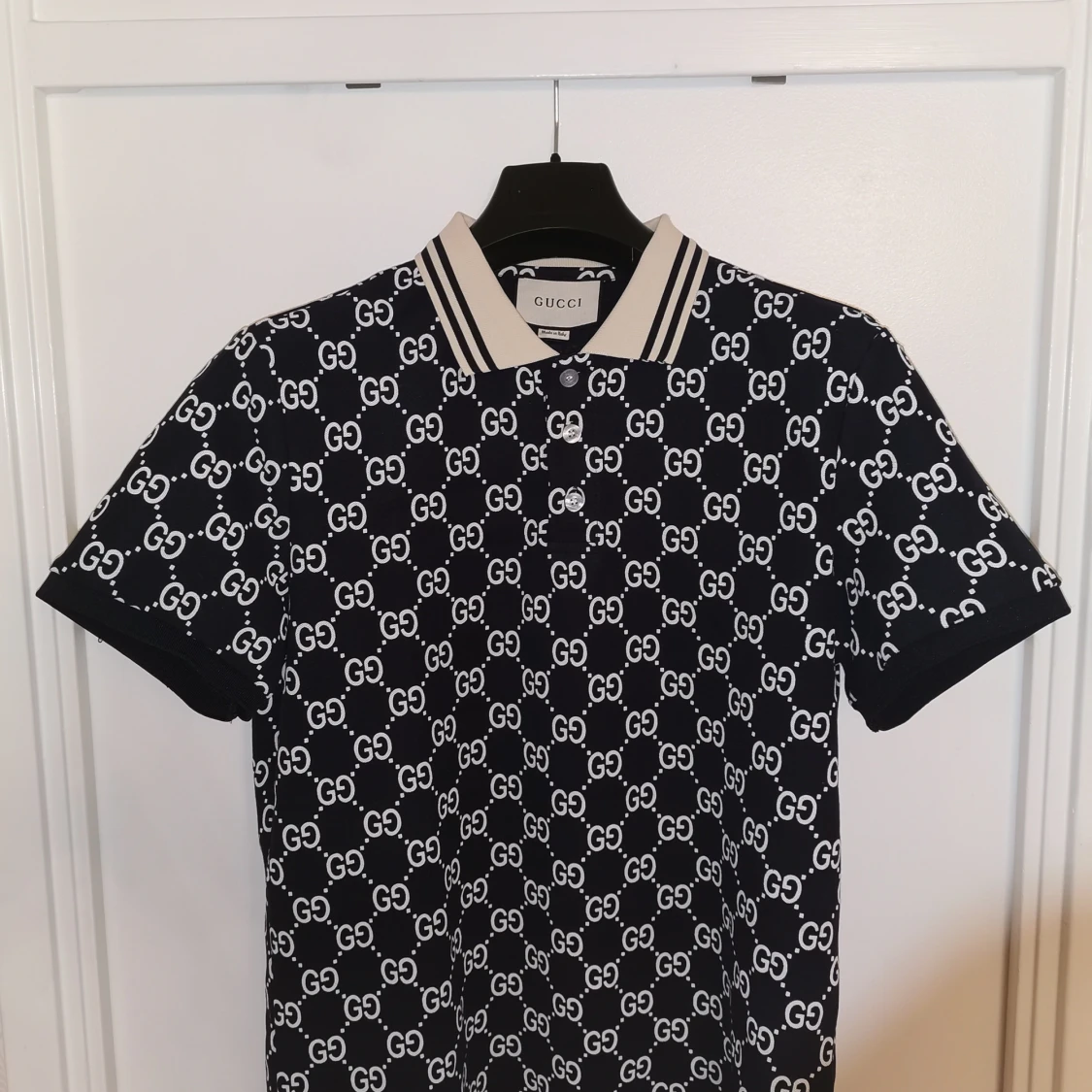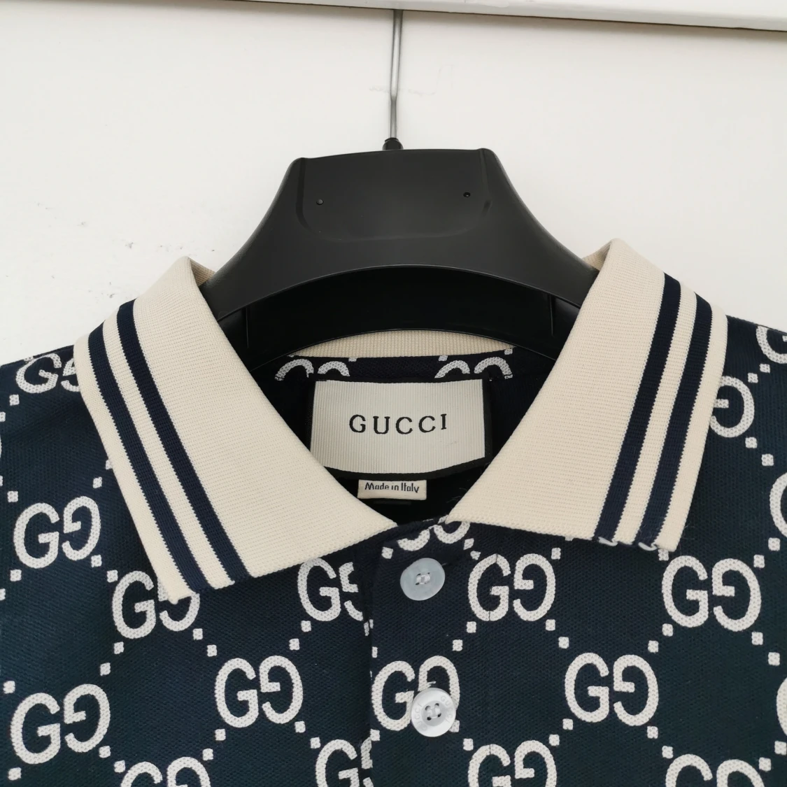 Snygg marinblå pikétröja från Gucci med klassiskt vitt GG-mönster över hela tröjan. Perfekt för dig som vill sticka ut med en lyxig och trendig look. Skriv ifall du undrar något!!