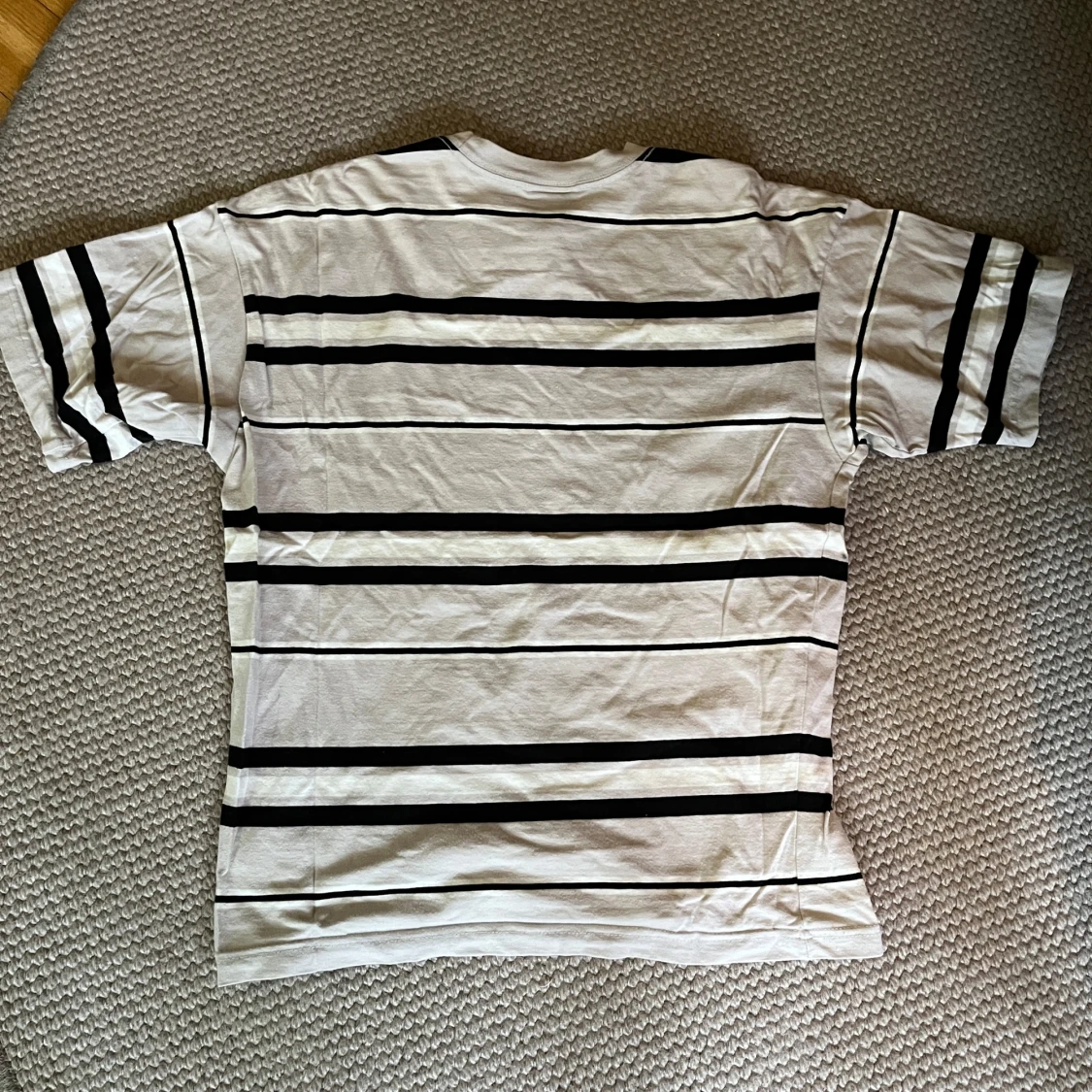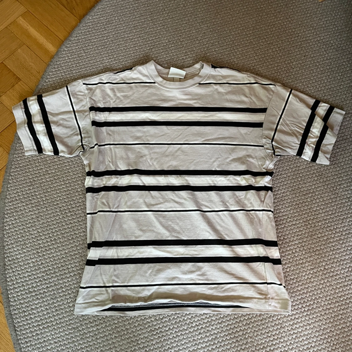 Säljer en randig t-shirt från H&M i oversized passform. T-shirten är vit med svarta ränder och har korta ärmar.
