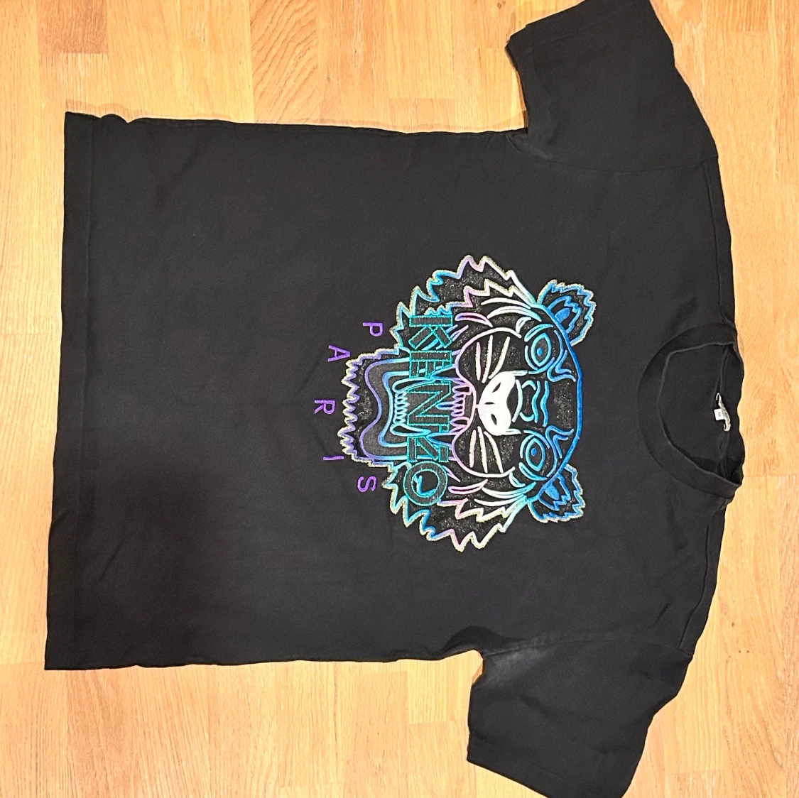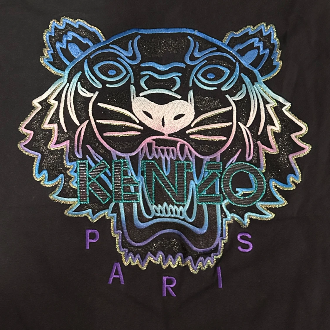 Snygg svart t-shirt från Kenzo med ett stort, färgglatt tigerbroderi på framsidan. Broderiet har nyanser av blått, rosa och lila.