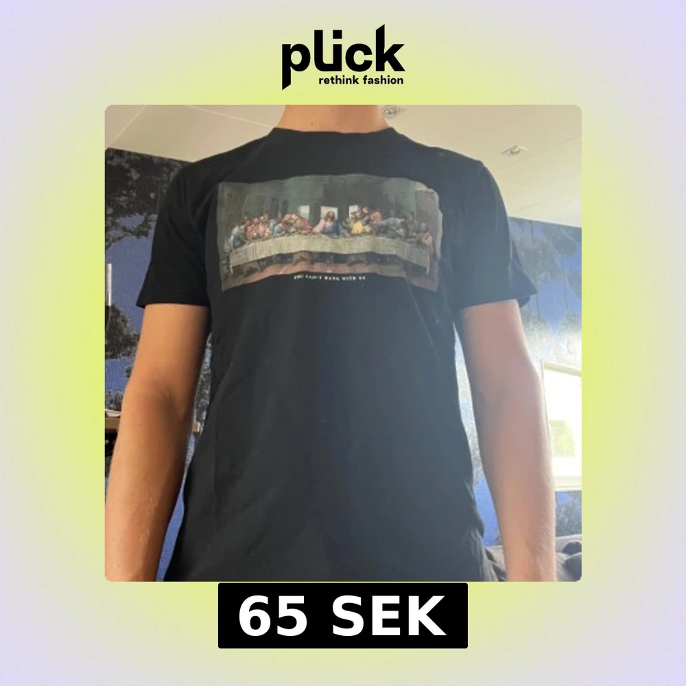 Säljer en svart t-shirt från Mister Tee i storlek M. T-shirten har ett stort tryck framtill med motiv inspirerat av 'The Last Supper' och texten 'You can't hang with us'. Perfekt för dig som gillar statement-plagg. Mkt bra skick! 🤩