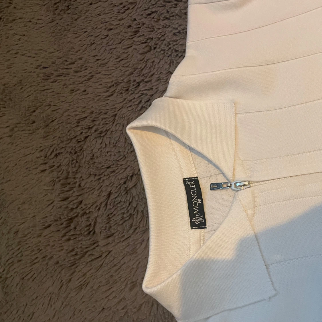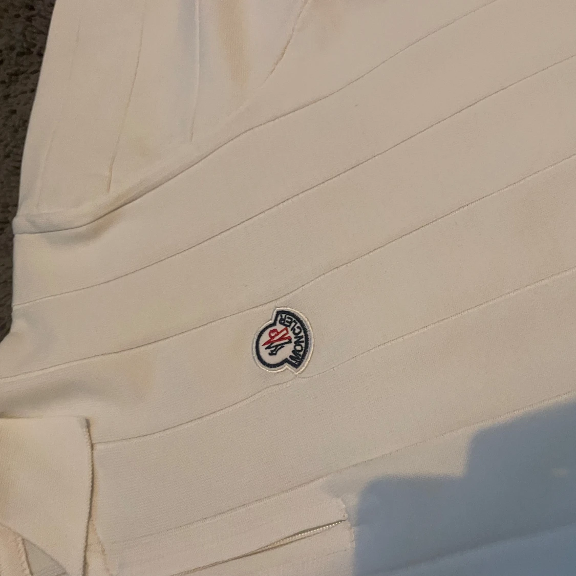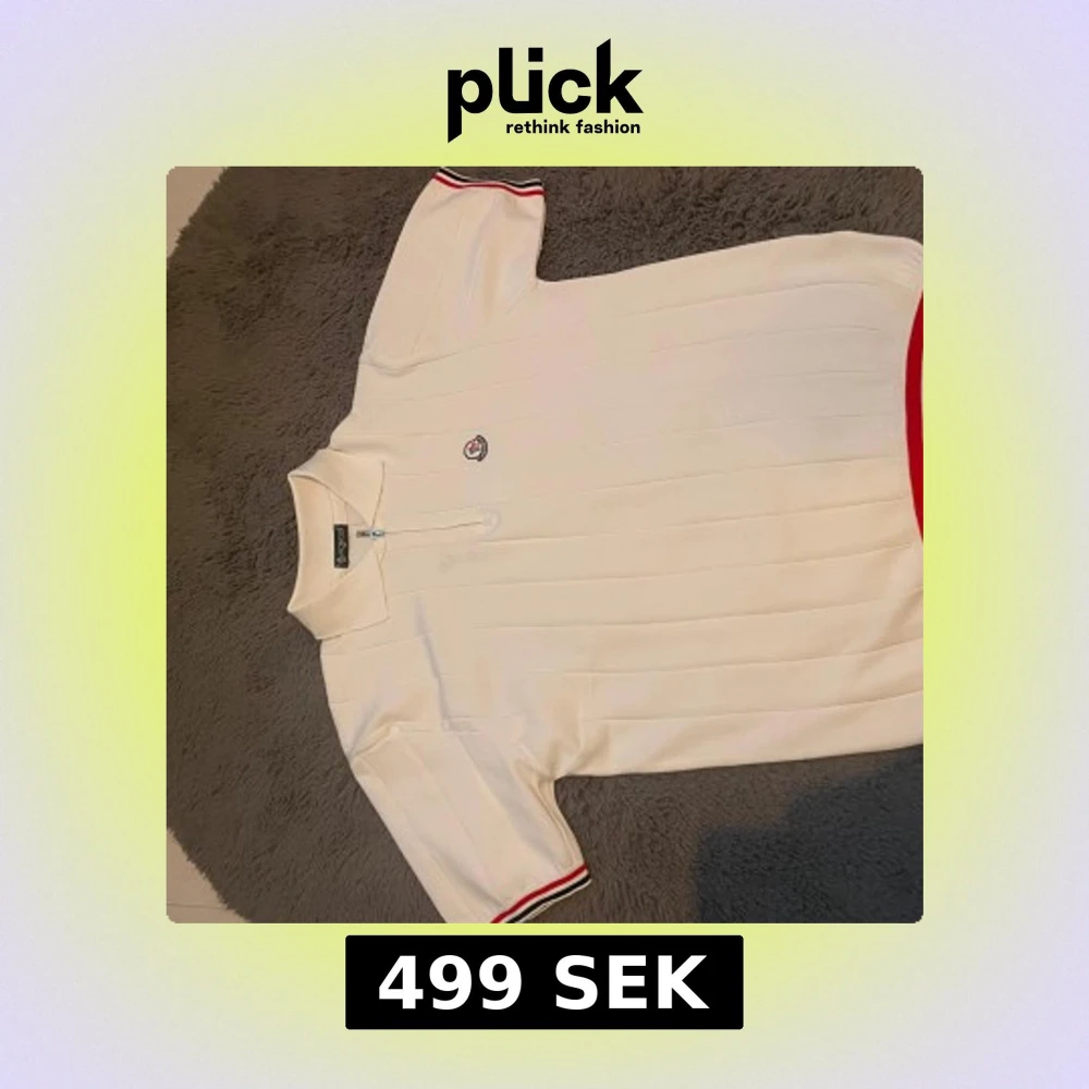 Vit t-shirt med kort ärm, diskret ribbad struktur och klassisk krage. Dragkedja framtill och broderad logga på bröstet. Röd och svart randig detalj på ärmslut och nederkant. Perfekt för en clean och sportig look.