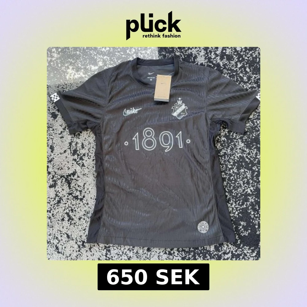 Säljer en svart AIK fotbollströja från Nike med klubbmärke och årtalet 1891 tryckt på bröstet. Tröjan har korta ärmar och diskreta mönster i tyget. Perfekt för dig som vill visa ditt AIK-stöd på match eller träning.