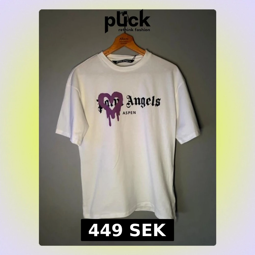 Palm Angels Aspen t-shirt i vit bomull med tryck framtill. Har ett stort lila hjärta med drip-effekt och svart text i gotisk stil. Klassisk rund hals och korta ärmar. Perfekt statement-plagg för dig som gillar streetwear och snygga prints.