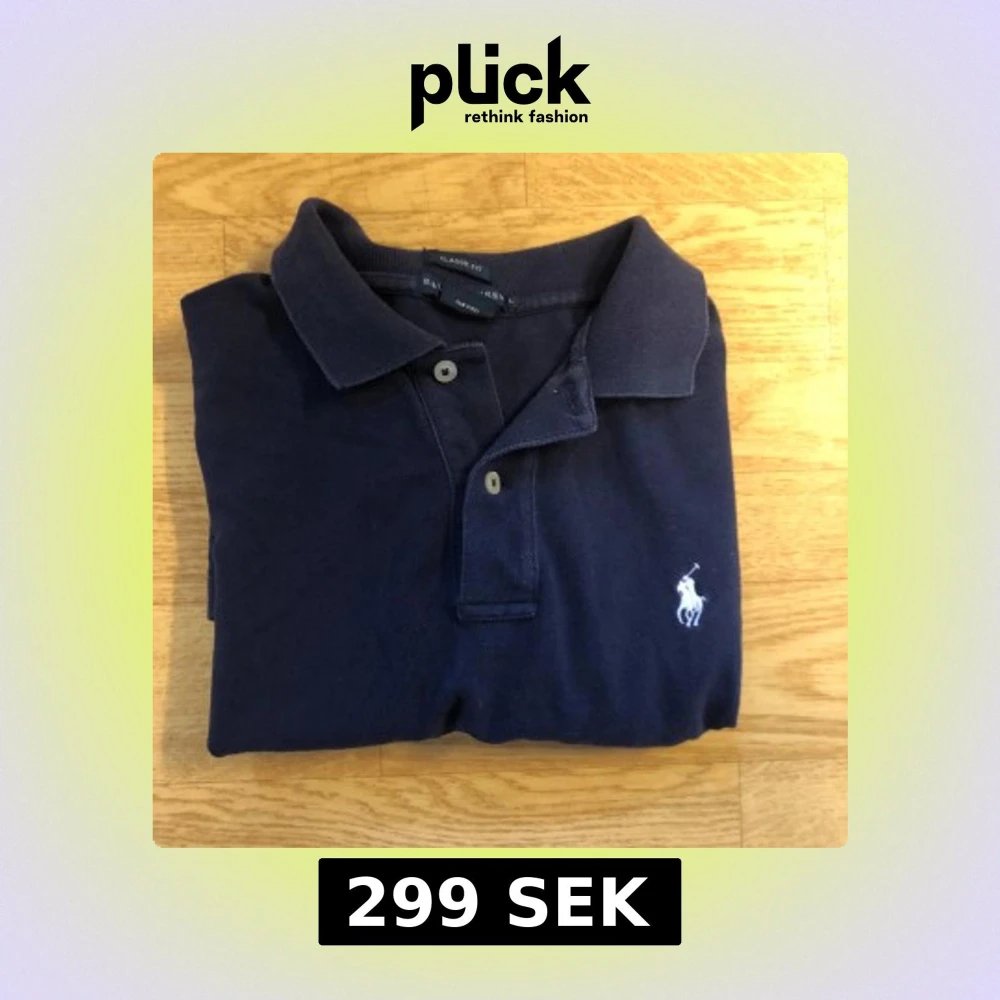 Snygg marinblå polo t-shirt från Ralph Lauren i klassisk passform. T-shirten har korta ärmar, krage och två knappar framtill. Ikoniska vita Polo-loggan broderad på bröstet. Perfekt för en clean och stilren look. Storlek L passar M