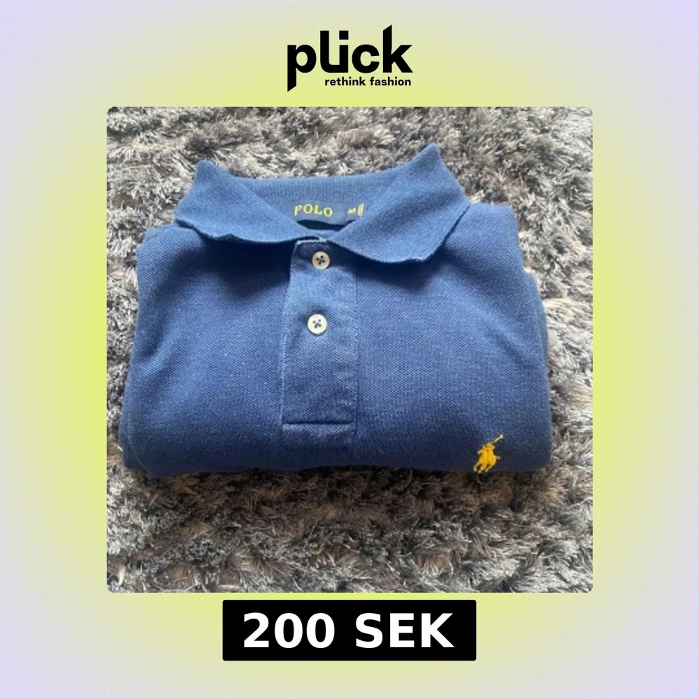 Säljer en klassisk blå pikétröja från Polo Ralph lauren med gul broderad logga på bröstet. Tröjan har korta ärmar och knappar framtill. Perfekt för en stilren och avslappnad look. Den har en liten fläck under hästen som du kan se på sista bilden. Kan sänka priset vid snabb affär.