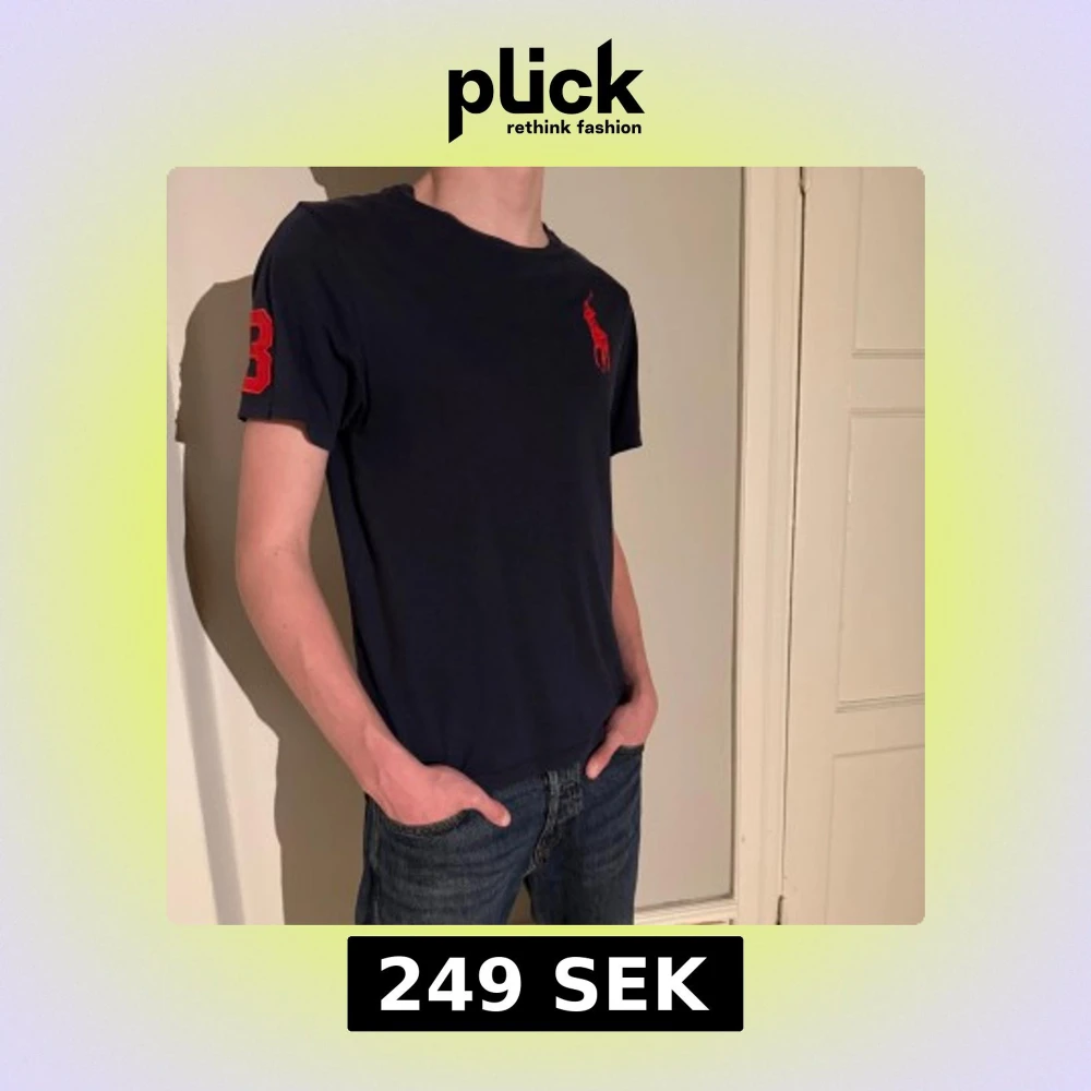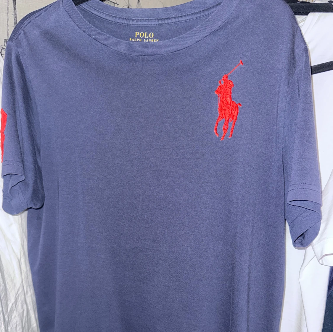 Snygg mörkblå t-shirt från Polo Ralph Lauren med röd broderad logga på bröstet och siffran 3 på ärmen. Perfekt till våren och sommaren. Modellen på bilden är 176cm.