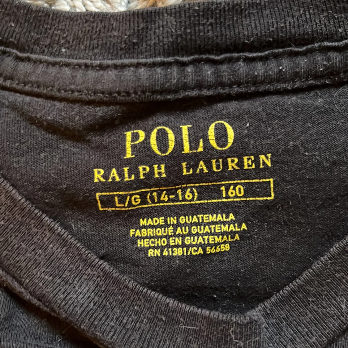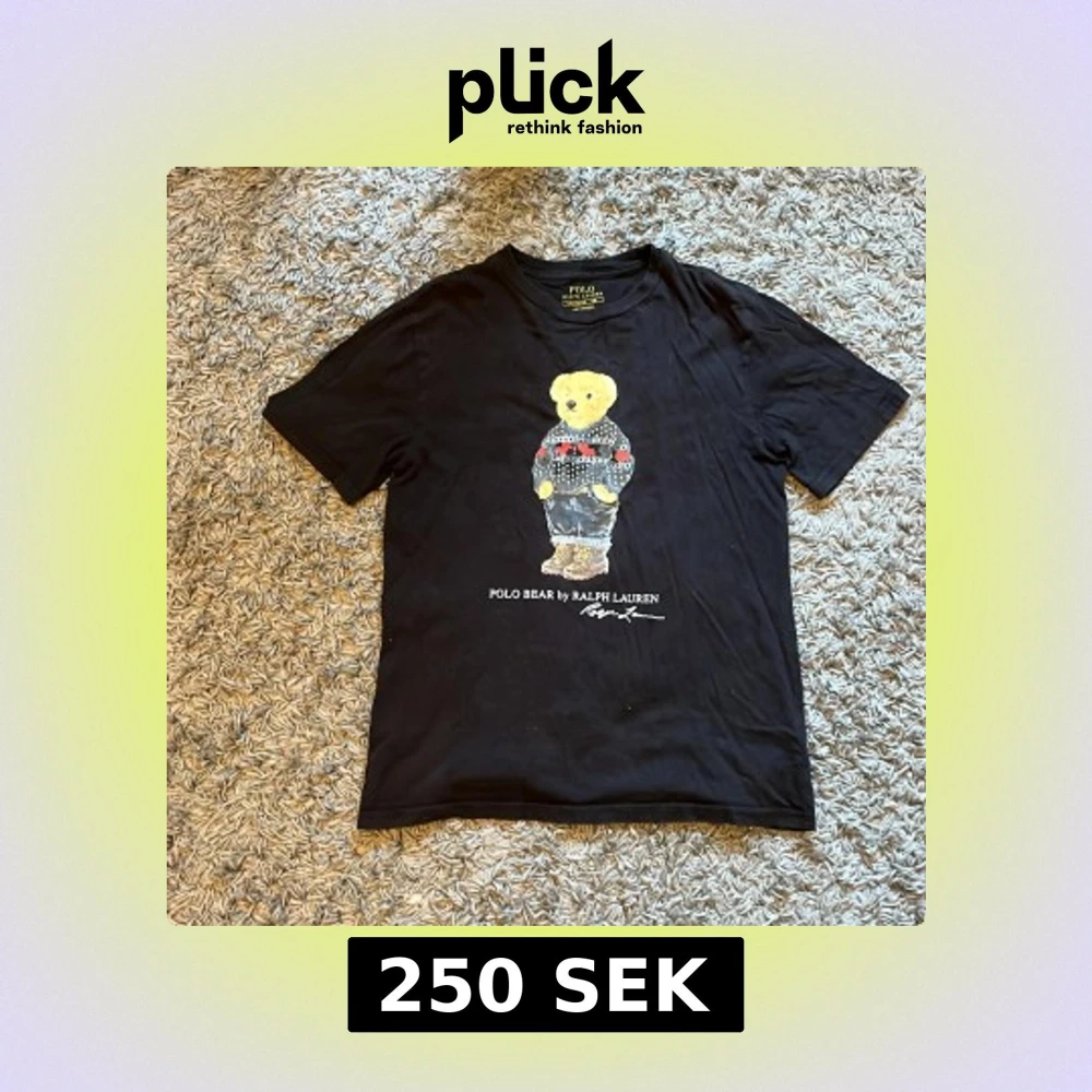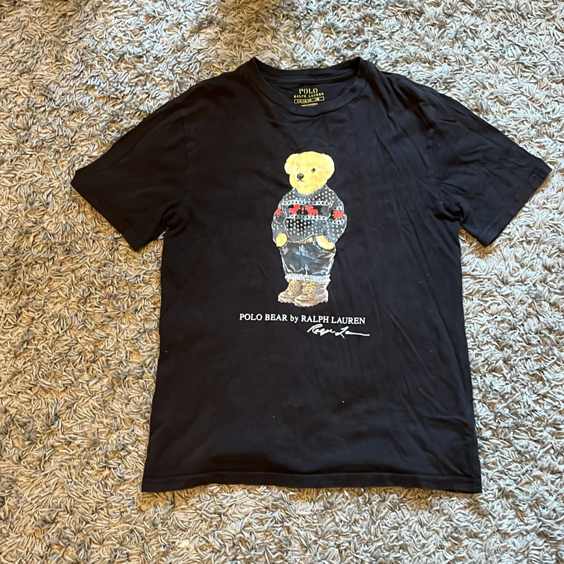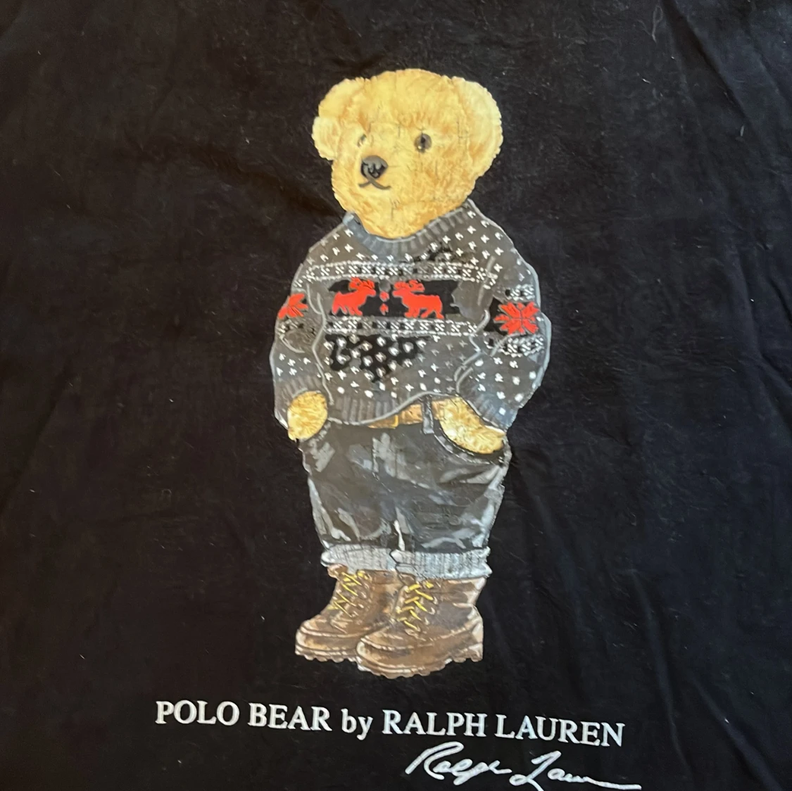 Svart t-shirt från Polo Ralph Lauren med ikoniskt Polo Bear-tryck på bröstet. Björnen har en stickad tröja med mönster och jeans, vilket ger en cool och lekfull vibe. T-shirten är i mjuk bomull och har klassisk passform med korta ärmar.