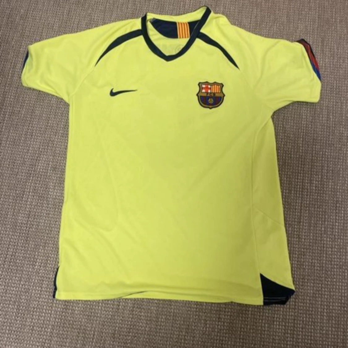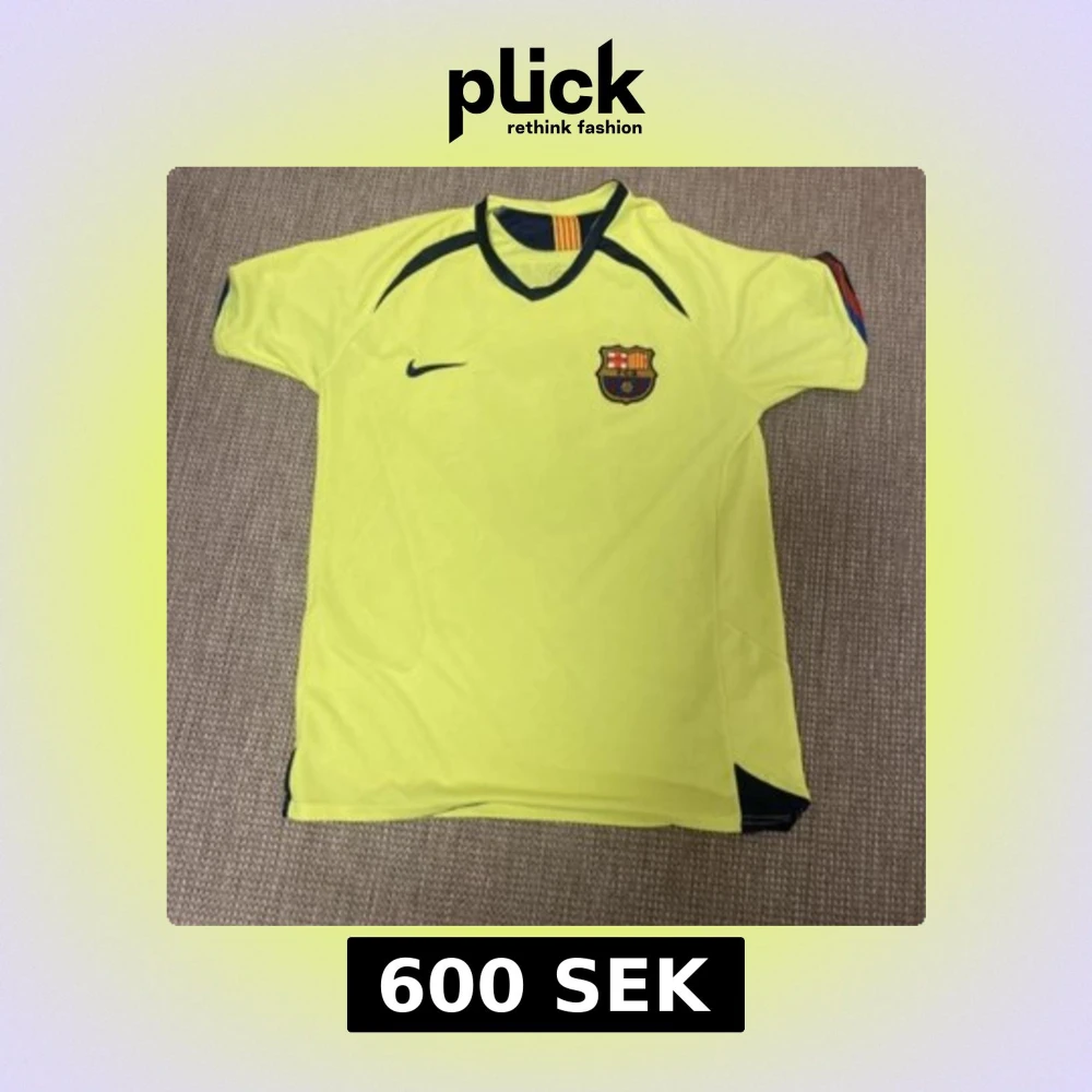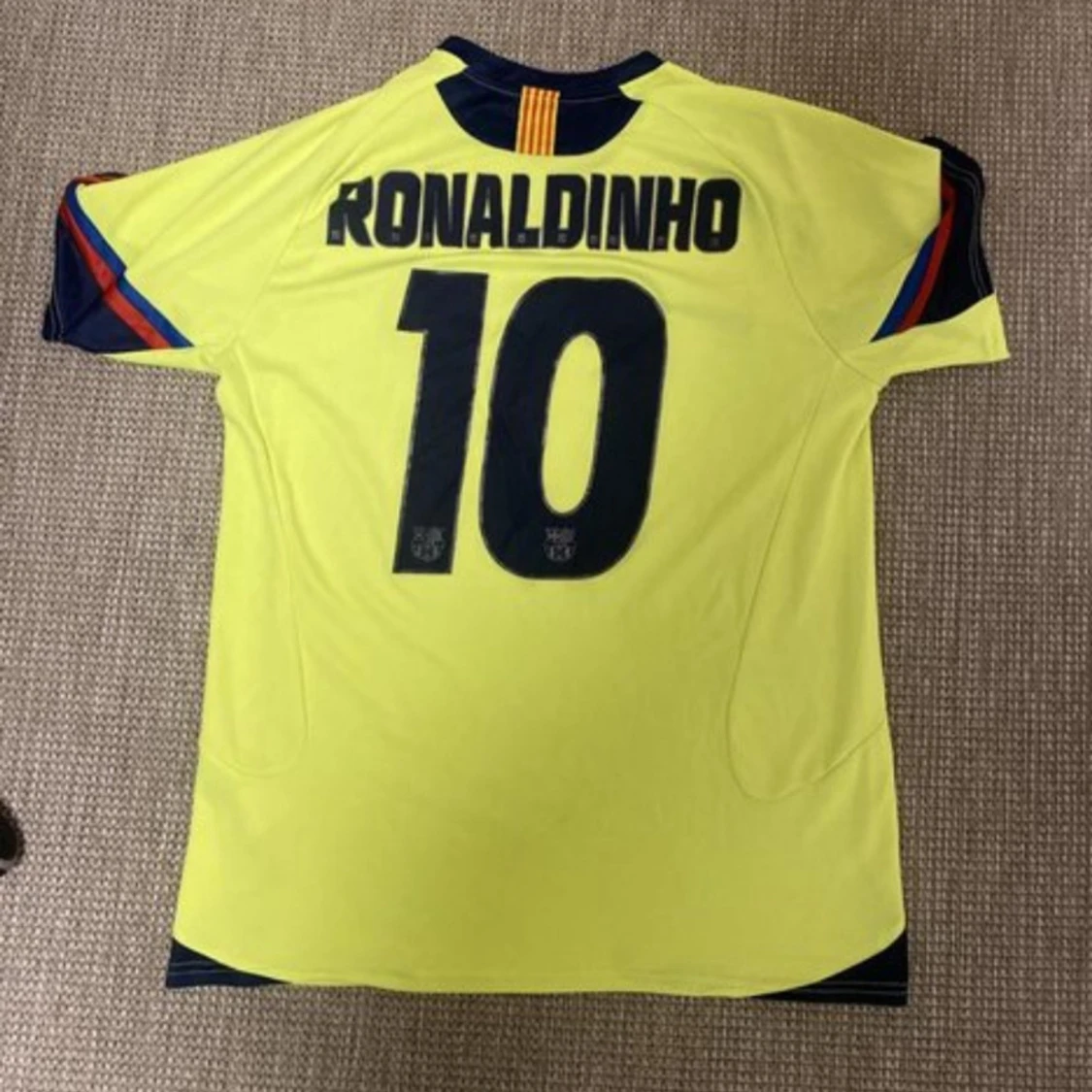 Gul Barcelona fotbollströja med Ronaldinho och nummer 10 på ryggen. Är i väldigt bra skick eftersom jag aldrig haft på mig den den har bara legat i garderoben. Det är i storlek L.