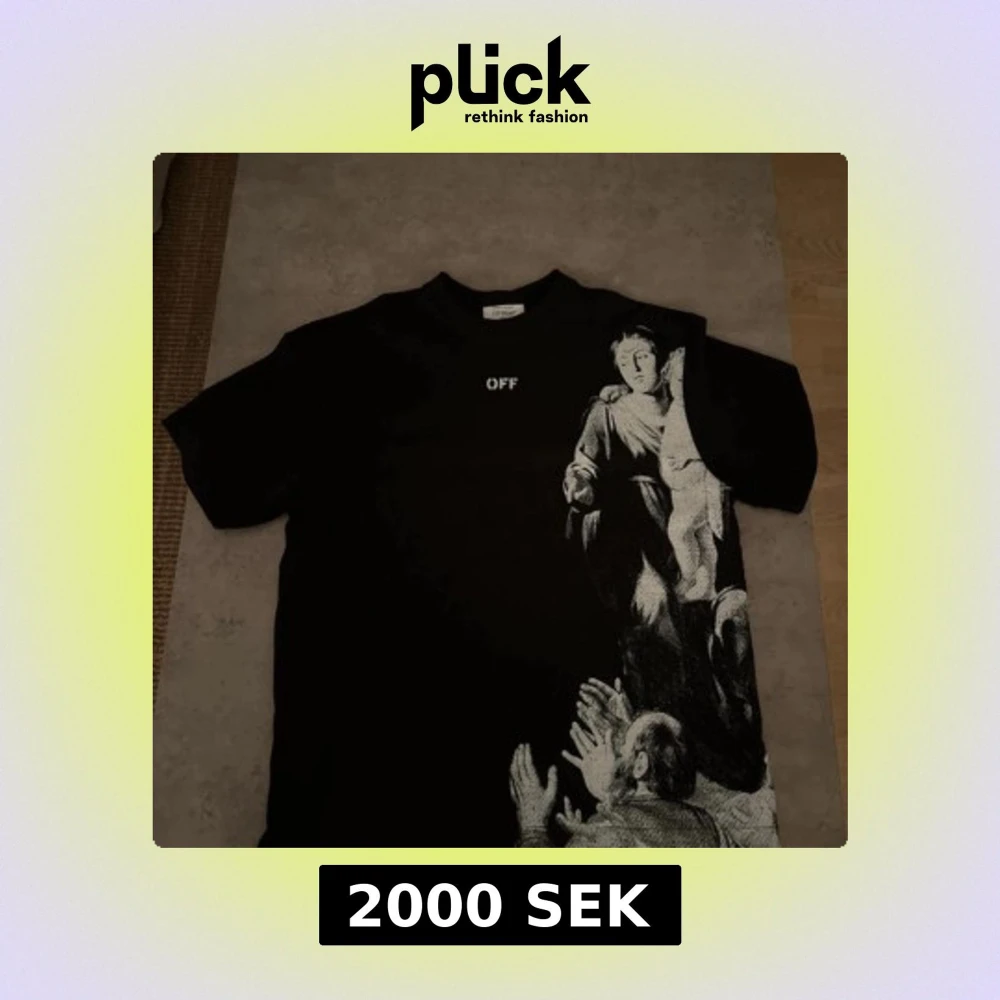 Svart t-shirt från Off-White med vit text 'OFF' på bröstet och ett stort konstnärligt print i vitt på framsidan. Baksidan har Off-White-loggan i vitt. Klassisk rund hals och korta ärmar. Materialet är mjuk bomull som känns skön mot huden. Finns med prislapp. Äkta