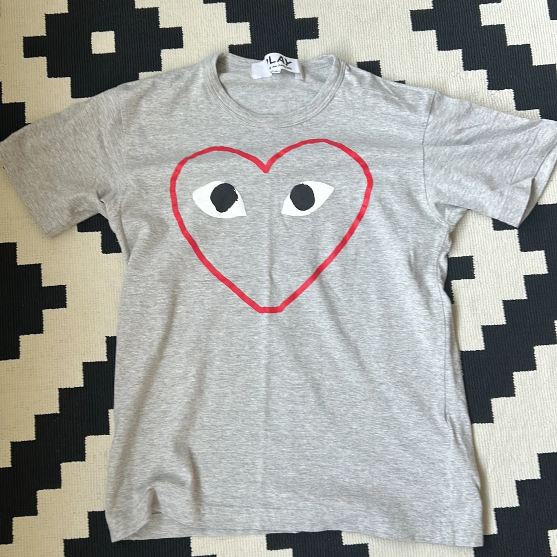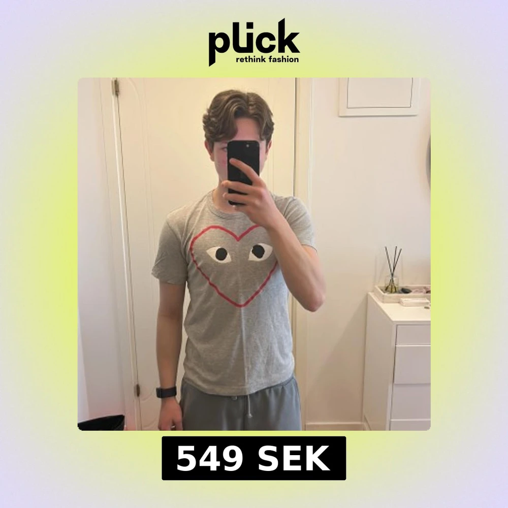 Säljer en grå t-shirt från Comme des Garçons Play med det ikoniska röda hjärtmotivet och ögon på bröstet. T-shirten är kortärmad och tillverkad i mjuk bomull. Perfekt för en stilren och trendig look.