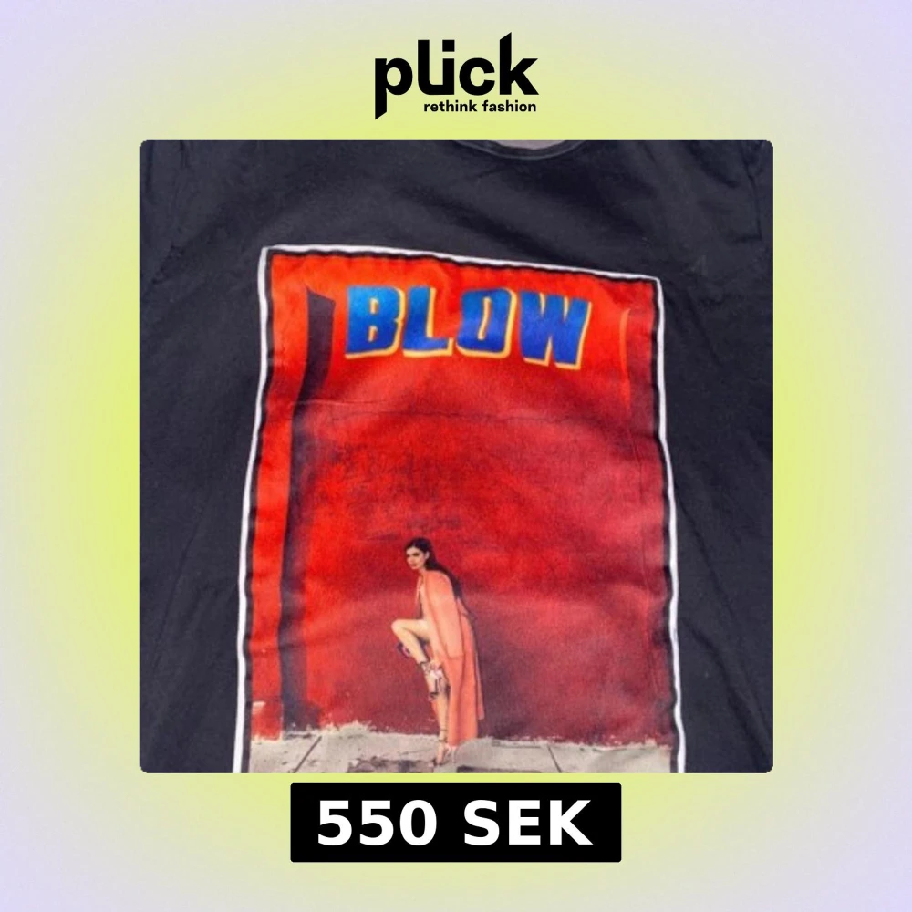 Snygg svart t-shirt från Limitato med ett färgstarkt tryck av en kvinna mot en röd bakgrund och texten 'BLOW' i blått och gult. Perfekt för dig som vill sticka ut med en unik design.