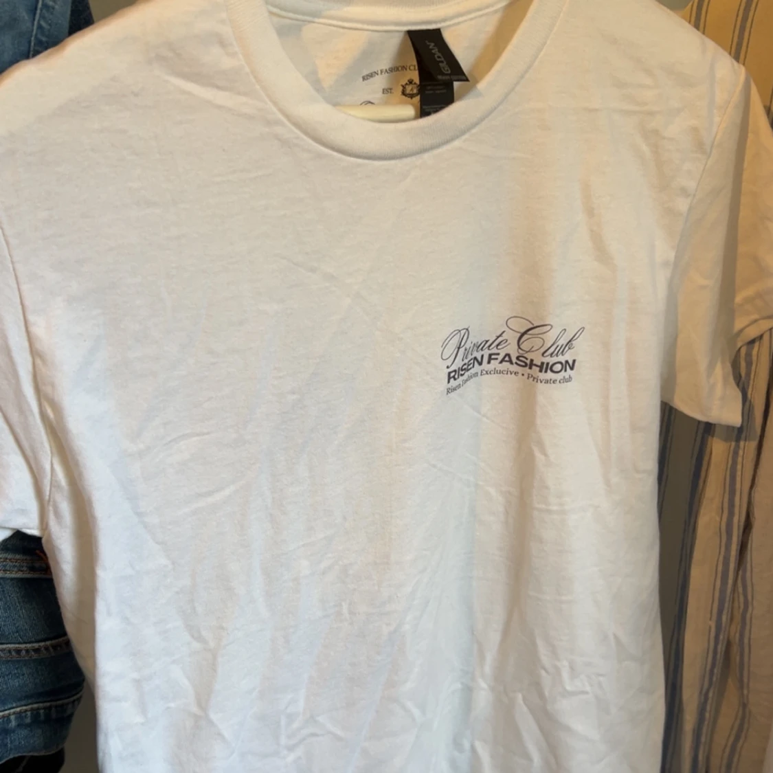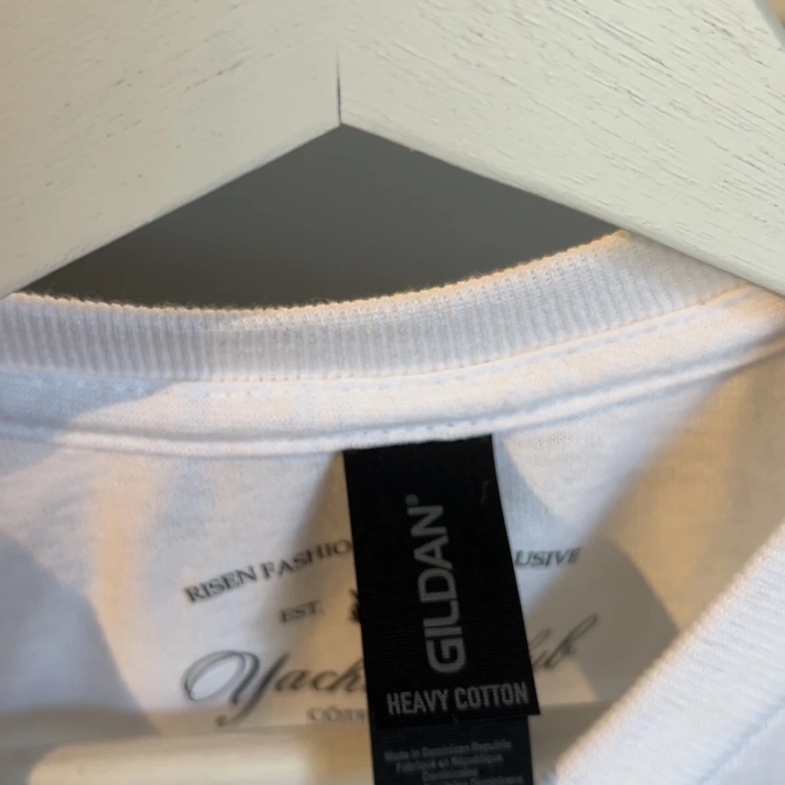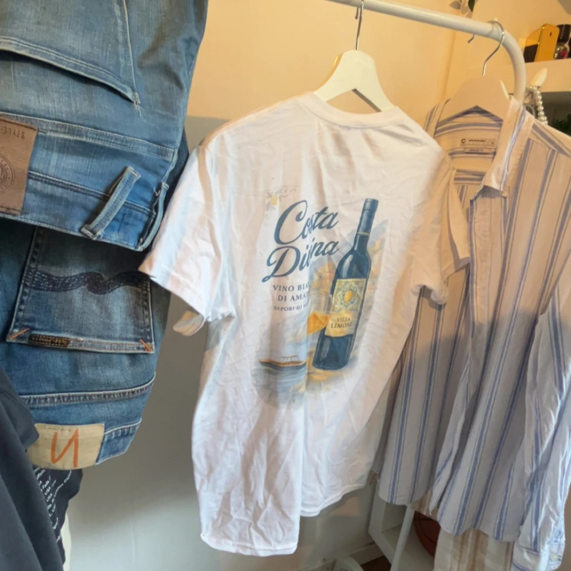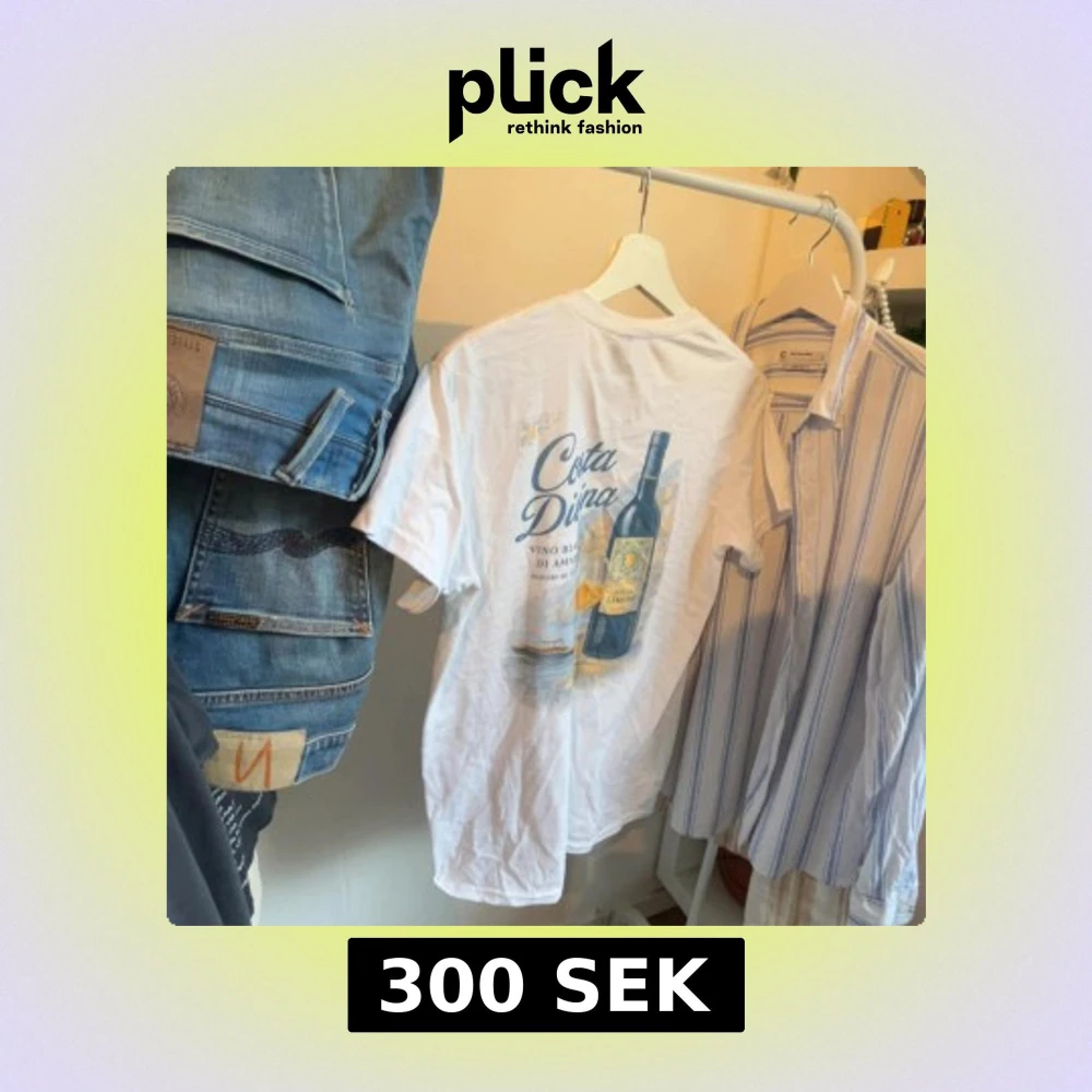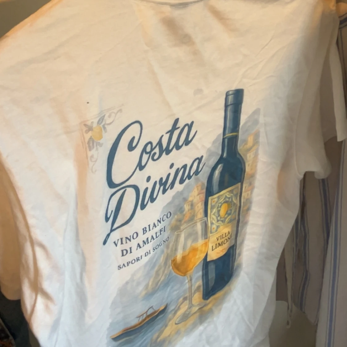 Vit t-shirt med tryck på ryggen som visar en vinflaska, glas och texten Costa Divina. Framsidan har ett diskret tryck med Private Club Risen Fashion. Rund hals och korta ärmar, tillverkad i heavy cotton för en skön känsla.