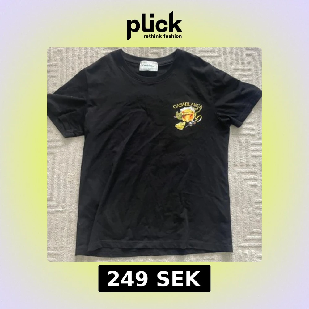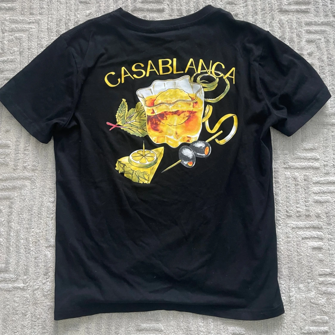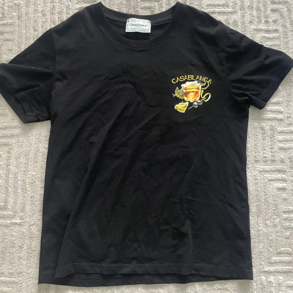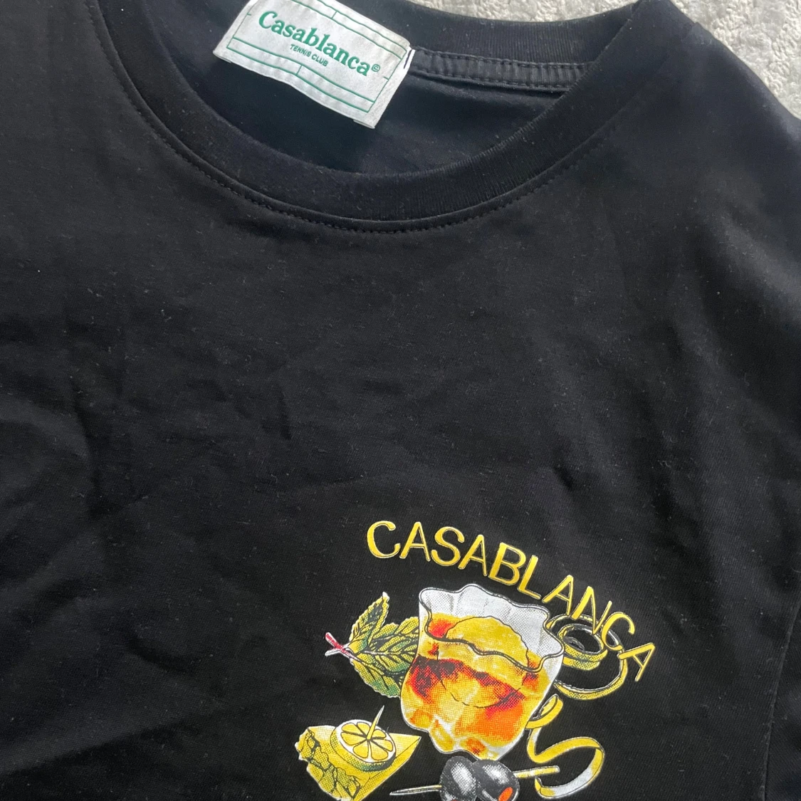 Svart t-shirt från Casablanca med färgglatt tryck av drink, citron och oliver både fram och bak. Klassisk rund hals och korta ärmar. Skön bomullskvalitet och snygg streetstil med cool grafik och gul text. Priset är inte hugget i sten! Vid fler frågor eller funderingar tveka inte på att skriva!