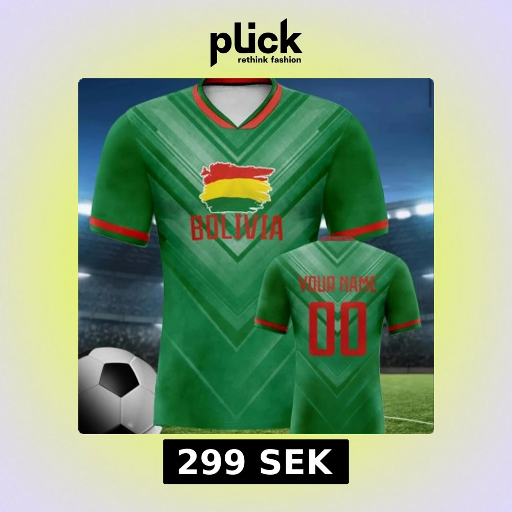 NI VÄLJER STORLEK! Snygg grön fotbollströja med Bolivia-flaggan och texten 'BOLIVIA' på bröstet. Röda detaljer vid krage och ärmslut. Personligt namn och nummer kan tryckas på ryggen. Perfekt för dig som vill sticka ut på planen.