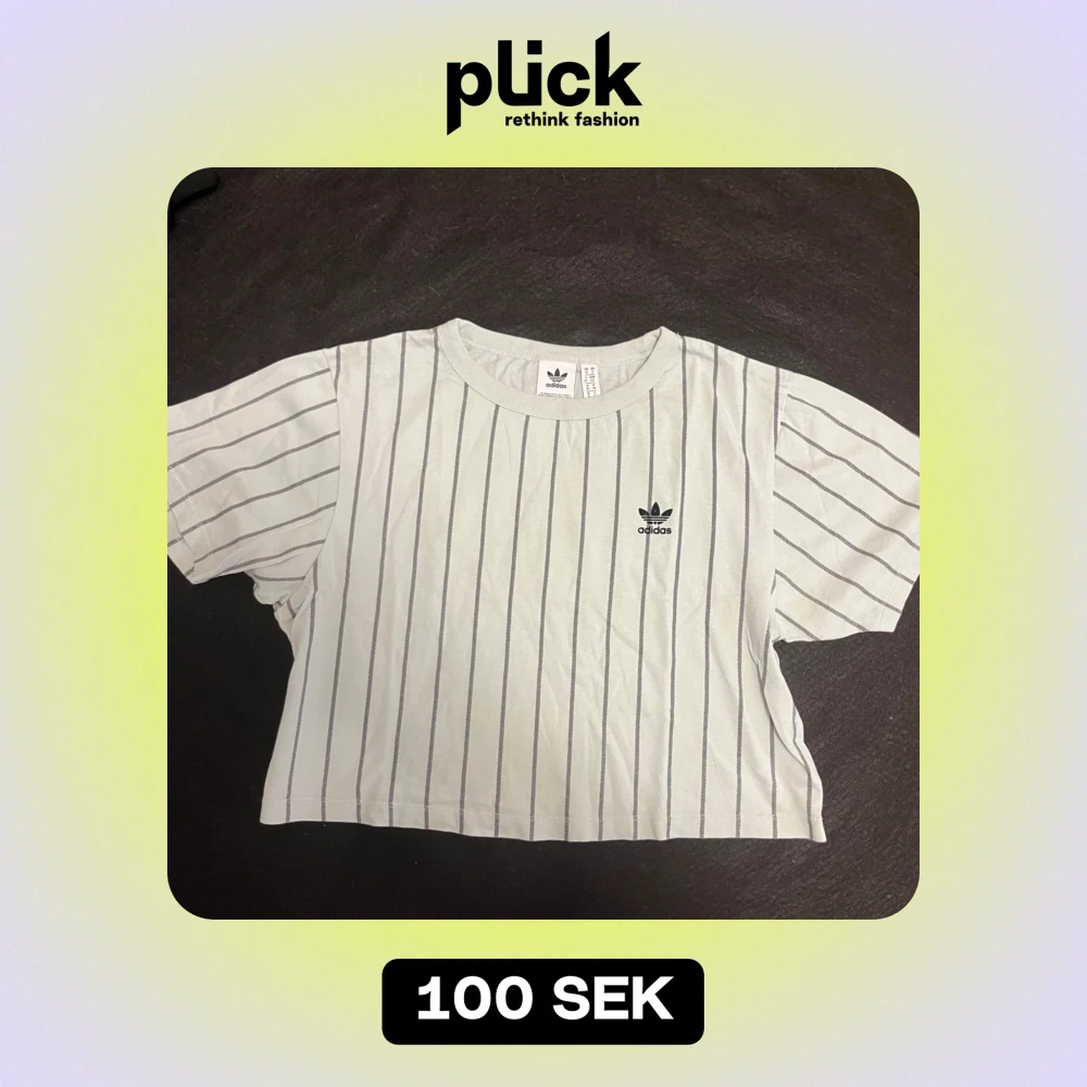 Säljer en snygg ljusgrön magtröja från Adidas med svarta ränder och deras klassiska logga på bröstet. T-shirten är kortärmad och har en avslappnad passform. Perfekt för en casual look eller träning. Säljer eftersom det inte riktigt passar min stil just nu🤍