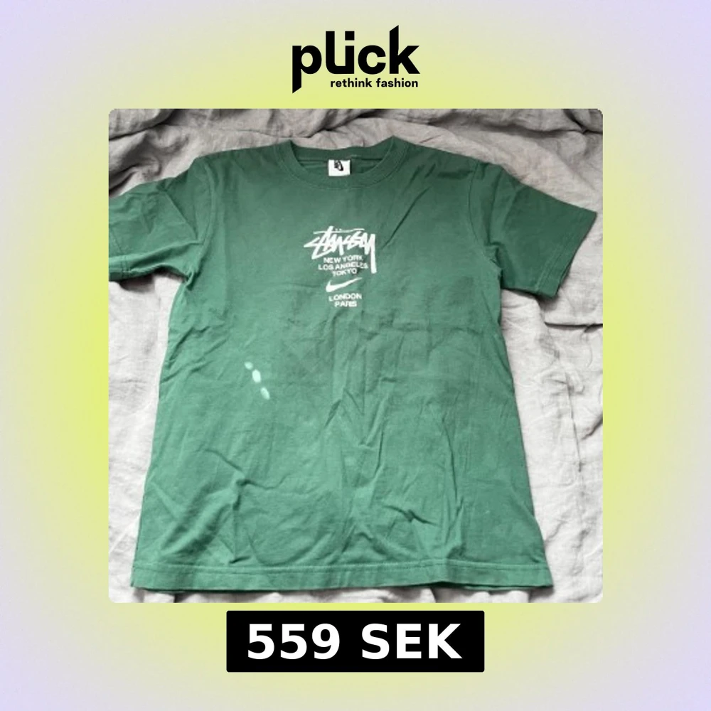 Snygg grön t-shirt från Stüssy och Nike med vit logga och tryck på bröstet. Klassisk passform med rund hals och korta ärmar. Perfekt för dig som gillar streetwear och vill sticka ut med en ikonisk collab. Knappt använd och sällsynt. Skick är som nytt. Passa dig mellan 160-170.