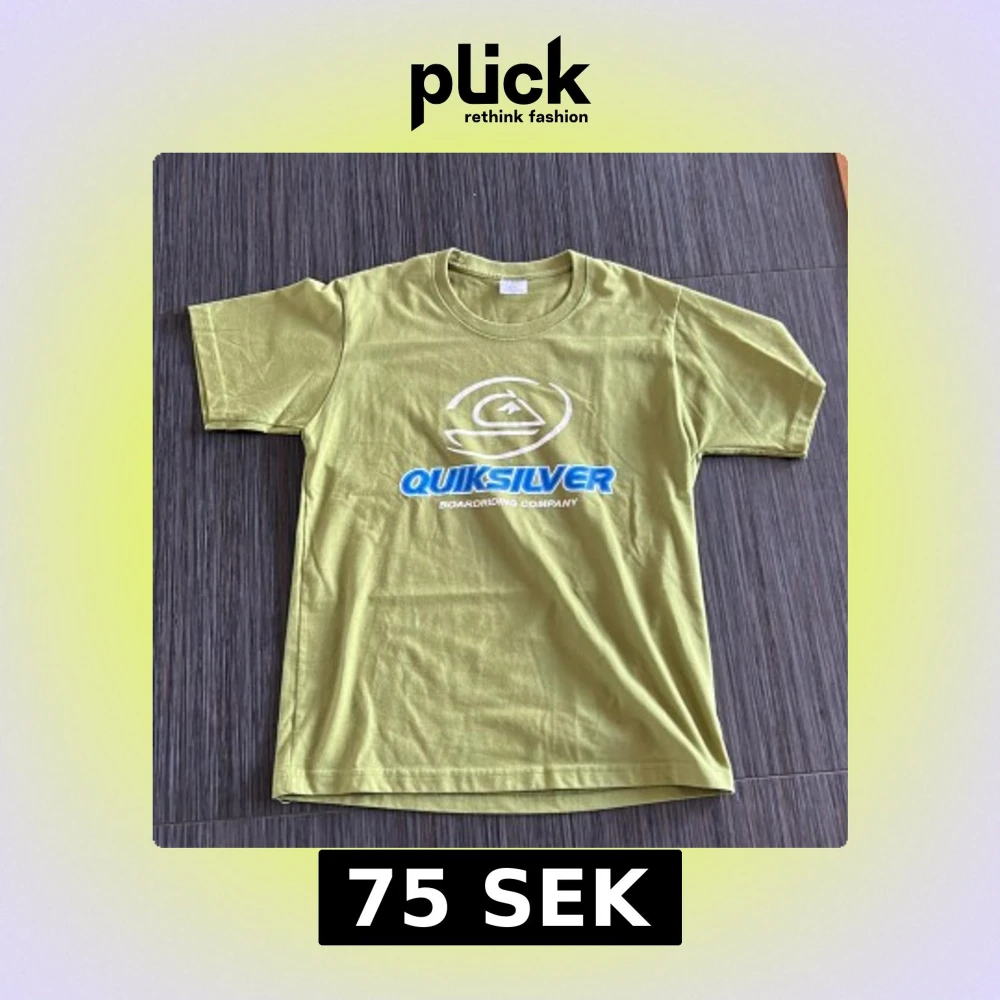 Säljer en grön t-shirt från Quiksilver med tryck i vitt och blått på framsidan. T-shirten har en rund halsringning och korta ärmar. Perfekt för en avslappnad stil. Pris kan diskuteras.