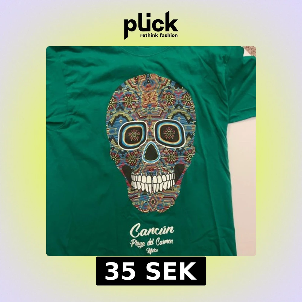 Cool grön t-shirt från Yazbek med ett stort färgglatt dödskalletryck inspirerat av mexikansk konst. Texten 'Cancún Playa del Carmen México' finns under motivet. Klassisk passform och rund hals, perfekt för dig som gillar unika prints.