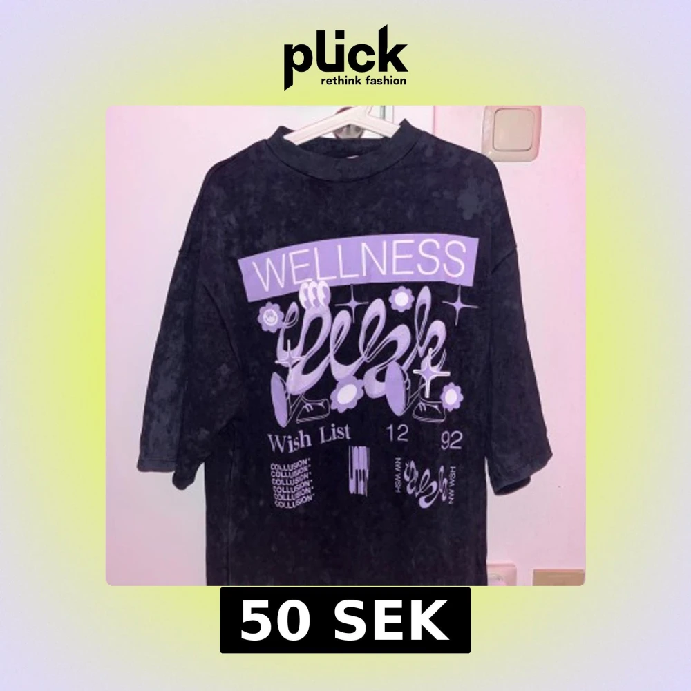 Cool svart t-shirt med lila tryck. Strl 32 MEN den är VÄLDIGT oversized, passa mer som en strl S/M. Jag bär strl XS och säljer pga den är för stor. Endast testad. ≈73 cm i längd (första bilderna är tagen med blixt, därför syns mönstret mer)