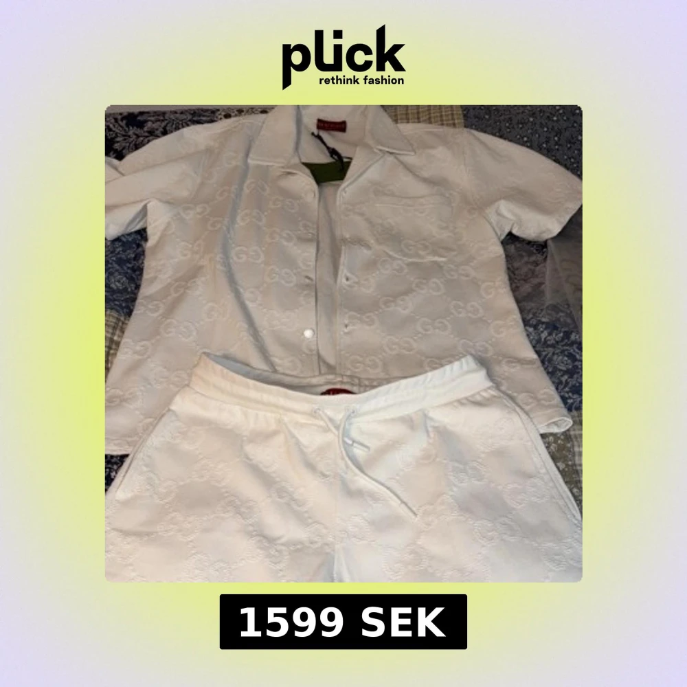 Snygg vit skjorta och shorts från Gucci med korta ärmar och klassisk krage. Skjortan har ett diskret mönster med Guccis GG-logga över hela tyget, bröstficka och knappar framtill. Materialet är mjukt och lyxigt, perfekt för dig som gillar exklusiv streetwear.