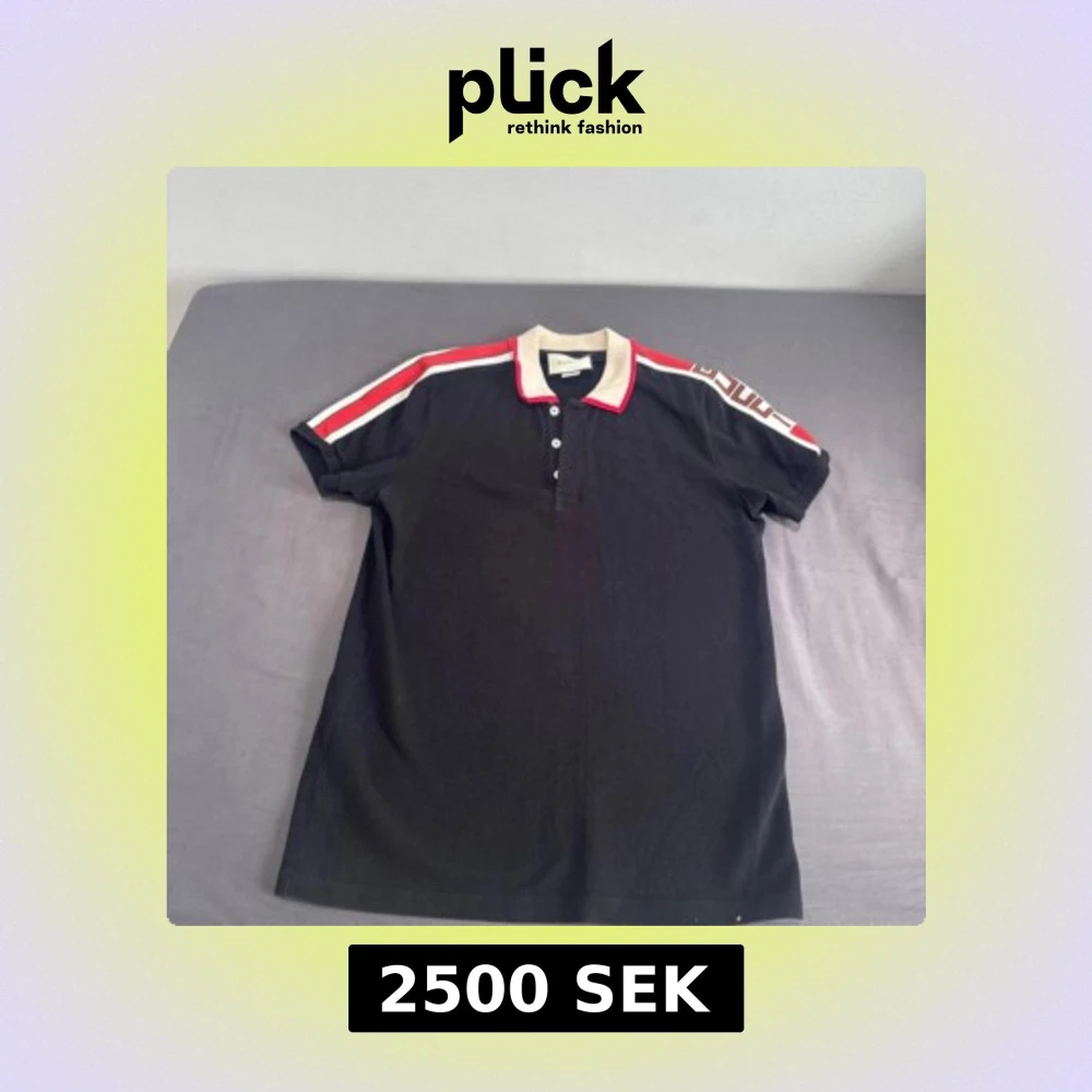 Gucci pikétröja i svart med beige krage och röda/vita detaljer längs axlarna. Snygg logga på ärmen och klassisk pikéknäppning framtill. Perfekt för dig som vill sticka ut med en lyxig och sportig vibe. Storlek L men kan passa för även personer med storlek m