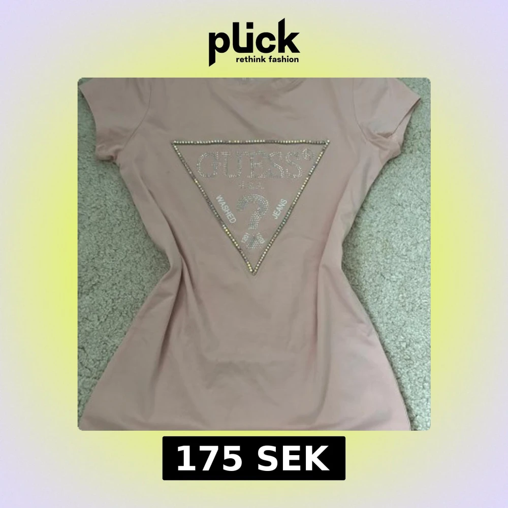 Snygg ljusrosa t-shirt från Guess med ikoniskt triangellogo framtill dekorerad med glittrande strass. Modellen är kortärmad och har en slim passform. Materialet är mjuk bomull som känns skönt mot huden. Knappast använd, köpt för 1 år sedan för 40 dollar (382kr nu).