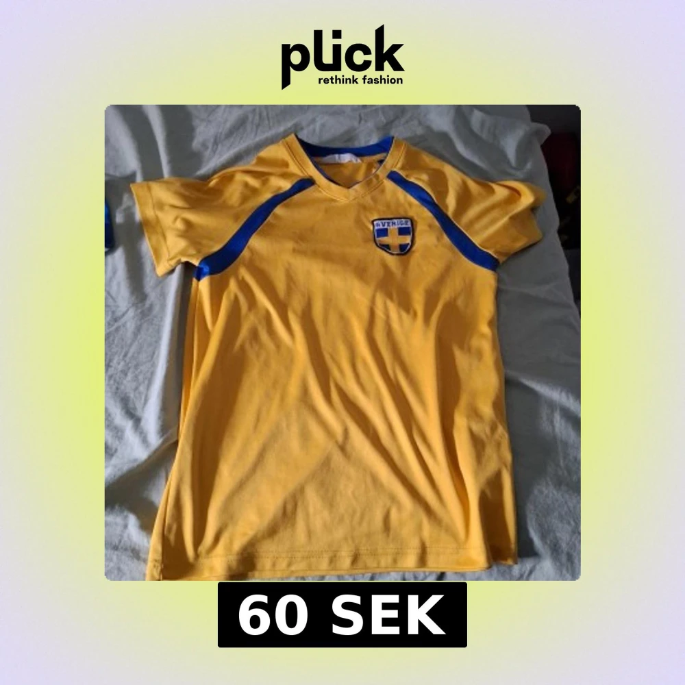 Säljer en gul fotbollströja från H&M med blå detaljer och texten 'Sverige' samt nummer 9 på ryggen. Tröjan har korta ärmar och ett emblem på bröstet. Perfekt för fotbollsfans!