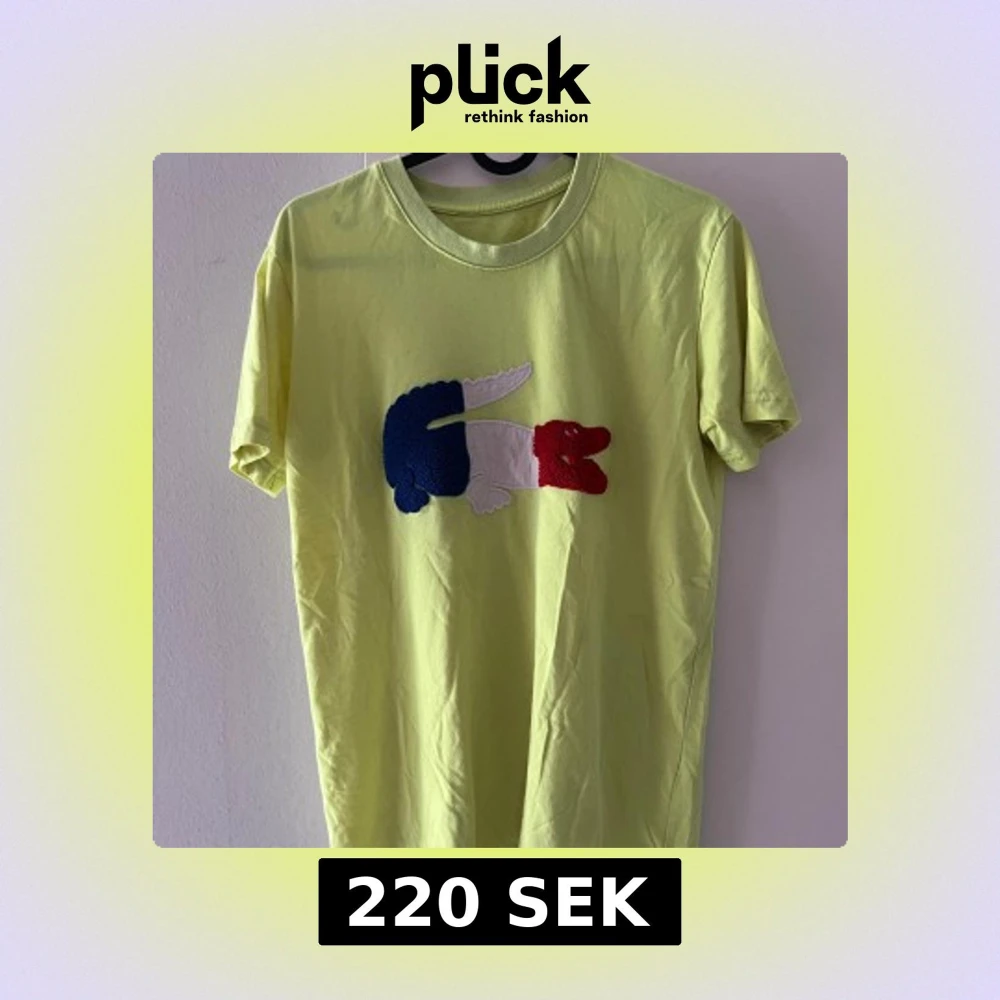 Gul t-shirt från Lacoste med stort broderat krokodilmärke i blått, vitt och rött på bröstet. Klassisk rund hals och korta ärmar. Perfekt för dig som vill sticka ut med en färgglad och ikonisk look.