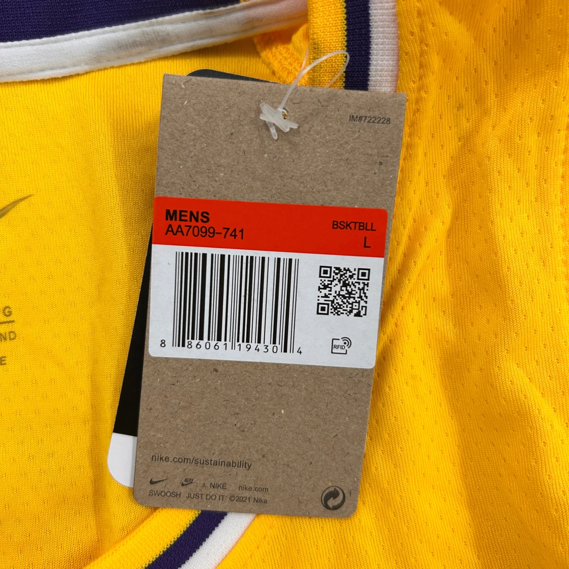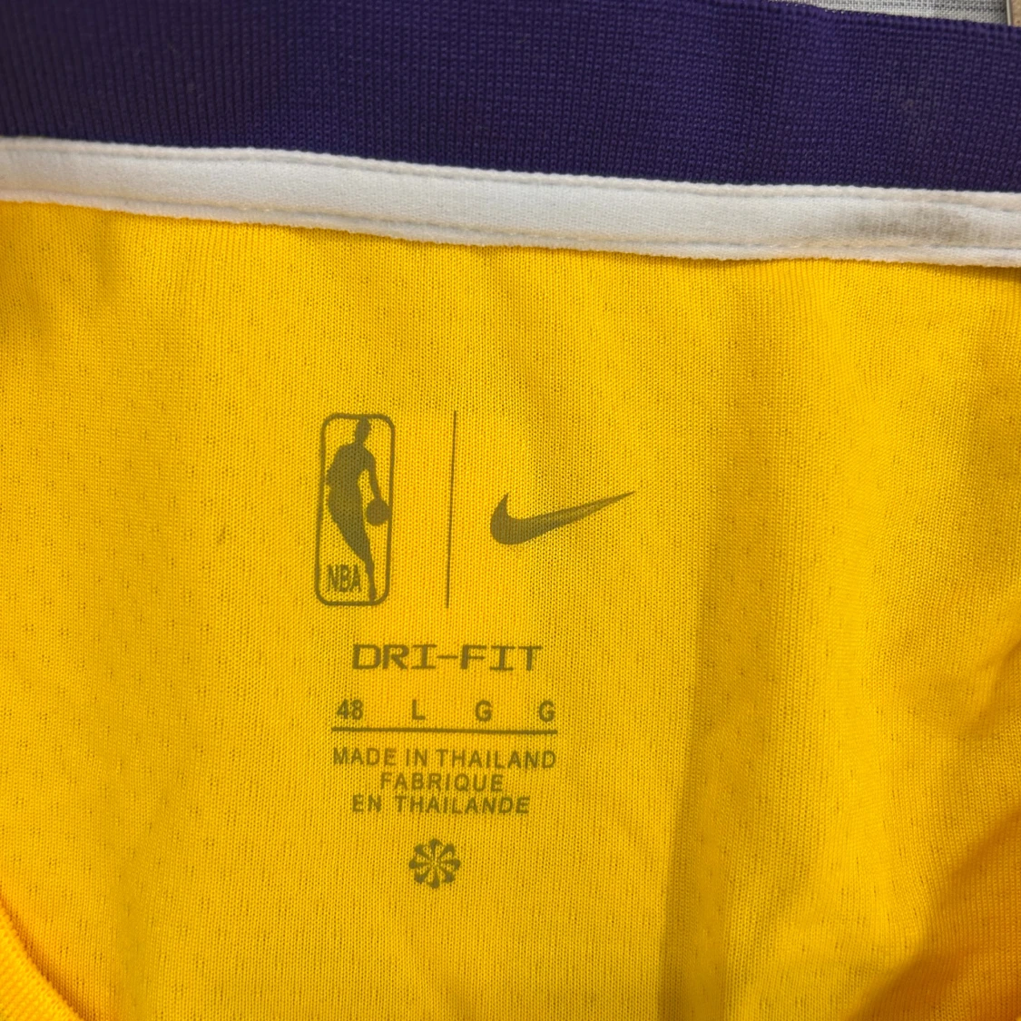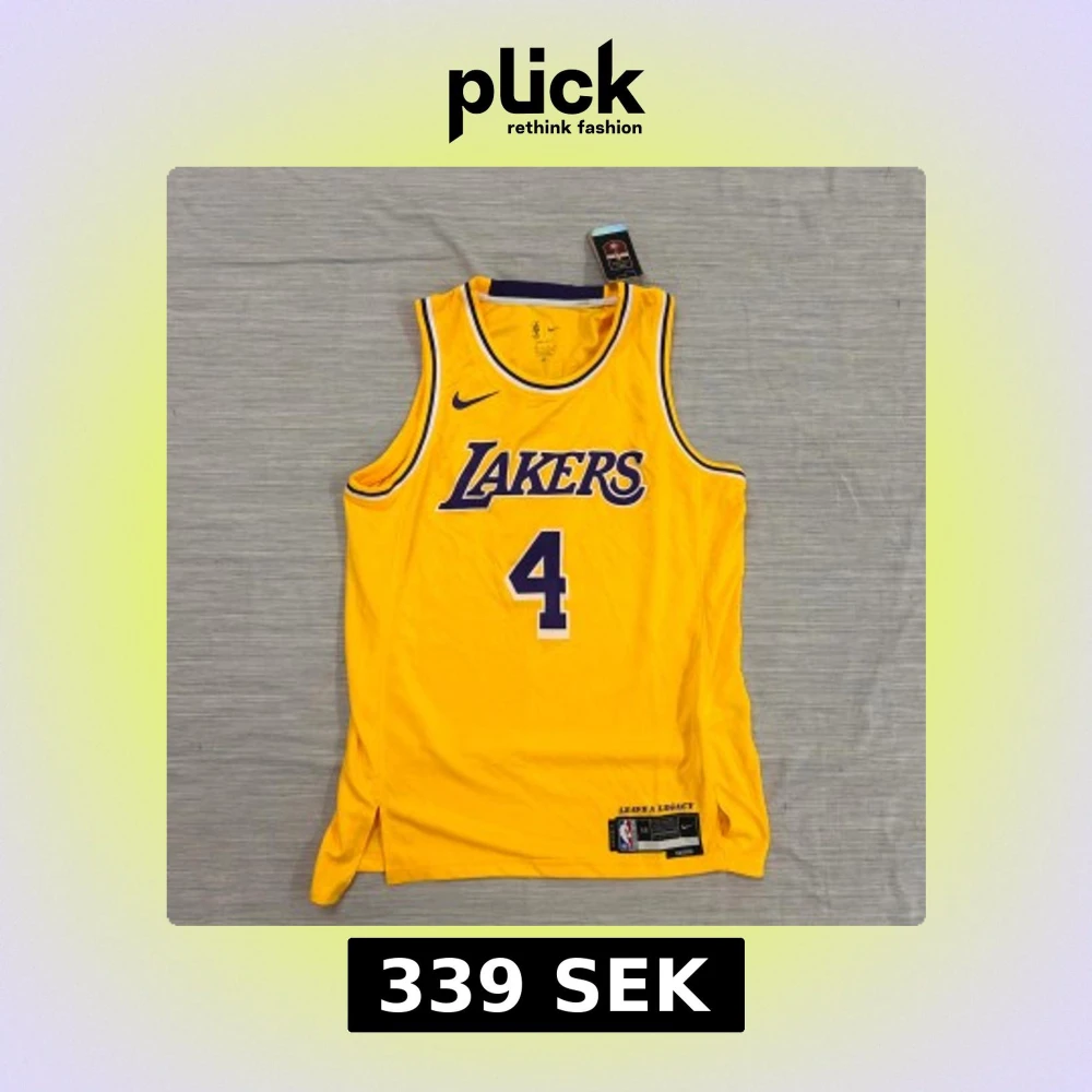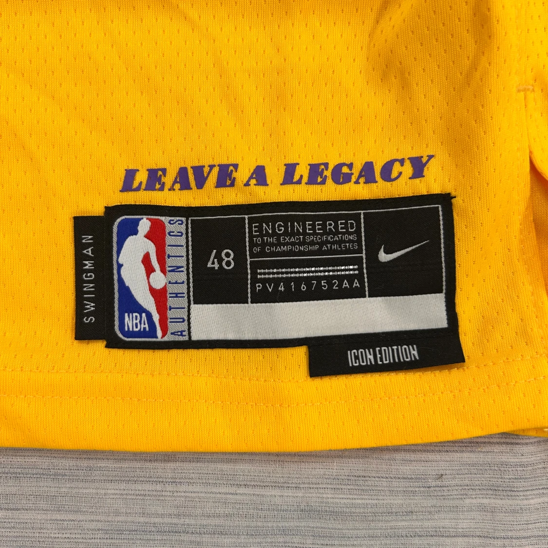 Snygg gul Lakers baskettröja från Nike, Icon Edition med nummer 4 på bröstet. Tröjan är ärmlös och har lila och vita detaljer runt hals och ärmhål. Tillverkad i Dri-Fit meshmaterial som andas, perfekt för träning eller match. NBA Authentics-märke och texten 'Leave a Legacy' nedtill.
