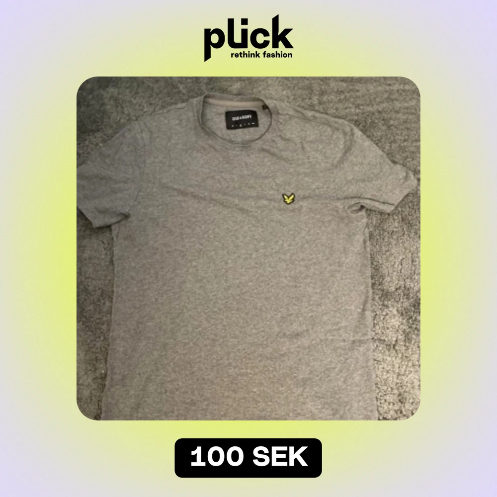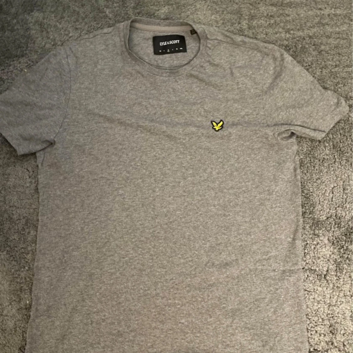 En grå t-shirt från Lyle & Scott med en liten gul logotyp på bröstet. T-shirten har korta ärmar och en rund halsringning. Passar L och M