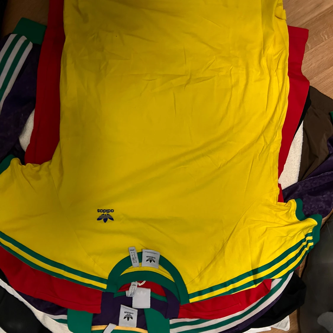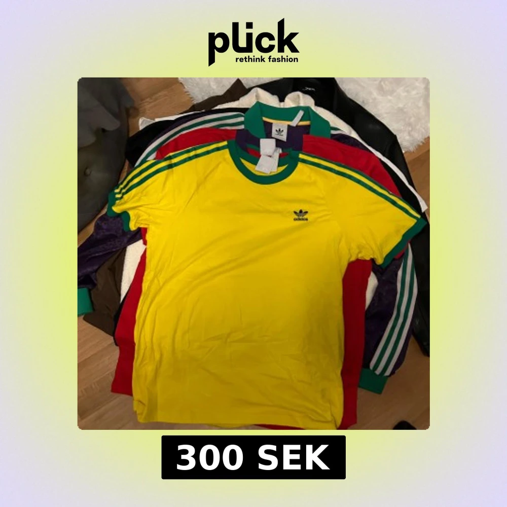 Säljer en gul t-shirt från Adidas med gröna och röda ränder på ärmarna och runt halsen. Den har en klassisk Adidas-logga på bröstet. Perfekt för en sportig look!