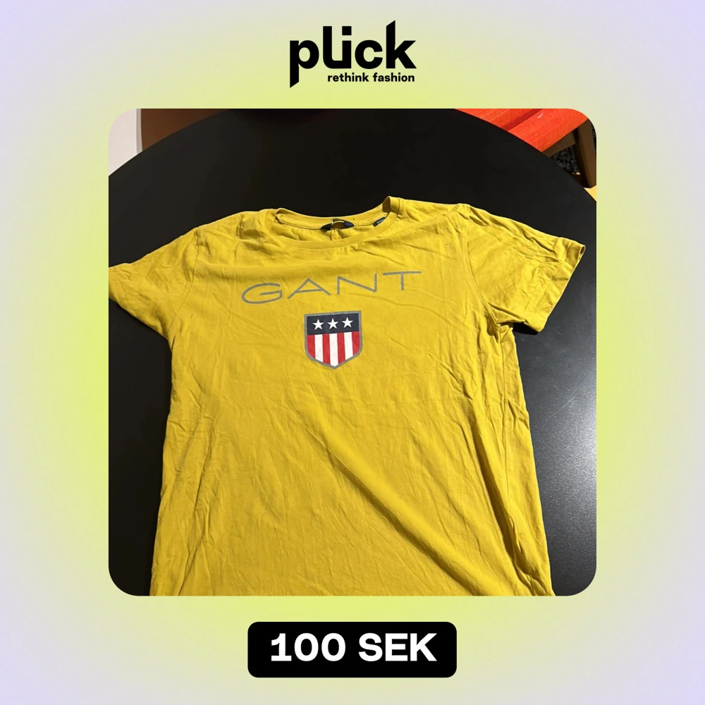 Säljer en snygg gul t-shirt från GANT med korta ärmar och ett coolt tryck på framsidan. Perfekt för sommardagar eller avslappnade tillfällen. T-shirten är i bra skick och gjord av mjukt bomullsmaterial.