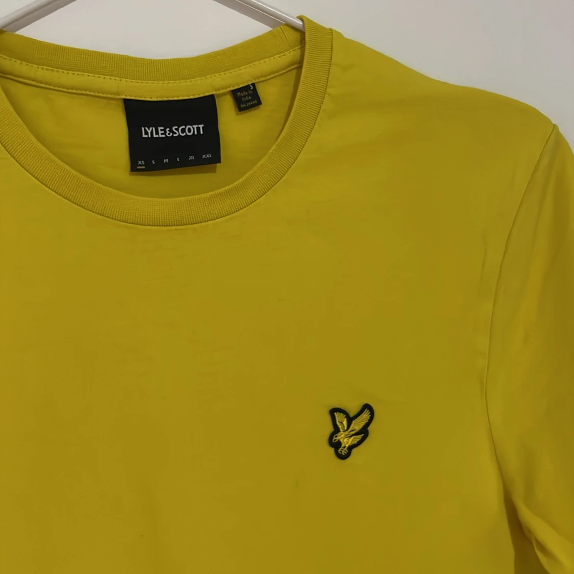 Snygg gul t-shirt från Lyle & Scott med klassisk rund hals och korta ärmar. På bröstet sitter den ikoniska fågel-loggan i svart och gult. T-shirten är gjord i mjuk bomull och har en clean, stilren look som passar perfekt till jeans eller shorts.