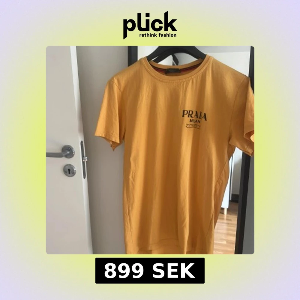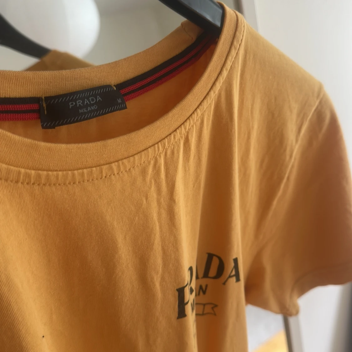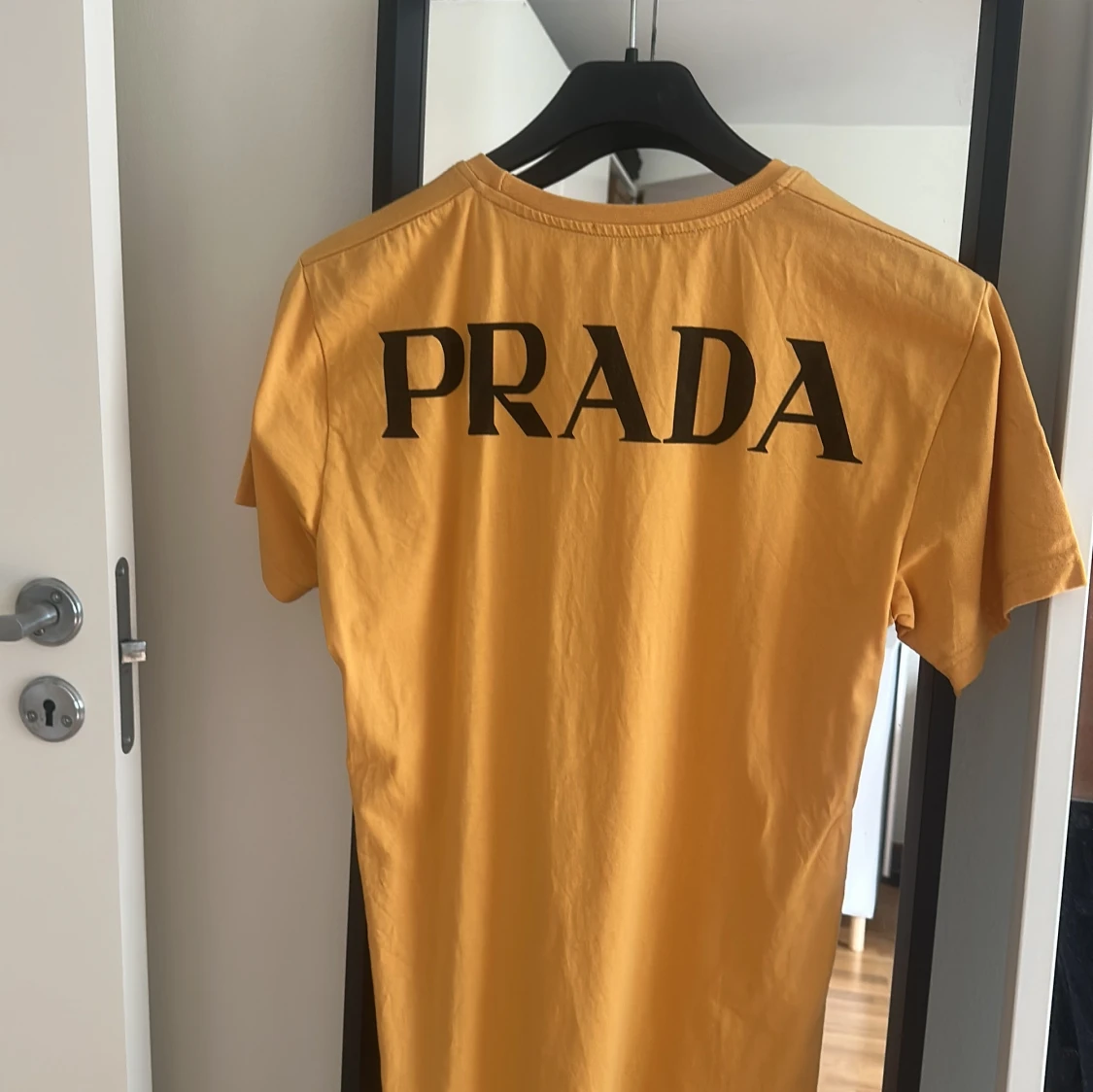 Gul t-shirt från Prada Milano med svart tryck både fram och bak. Klassisk rund hals och korta ärmar. Materialet är mjuk bomull och passformen är normal. Perfekt för dig som gillar stilrena designer och vill sticka ut med en ikonisk logga.