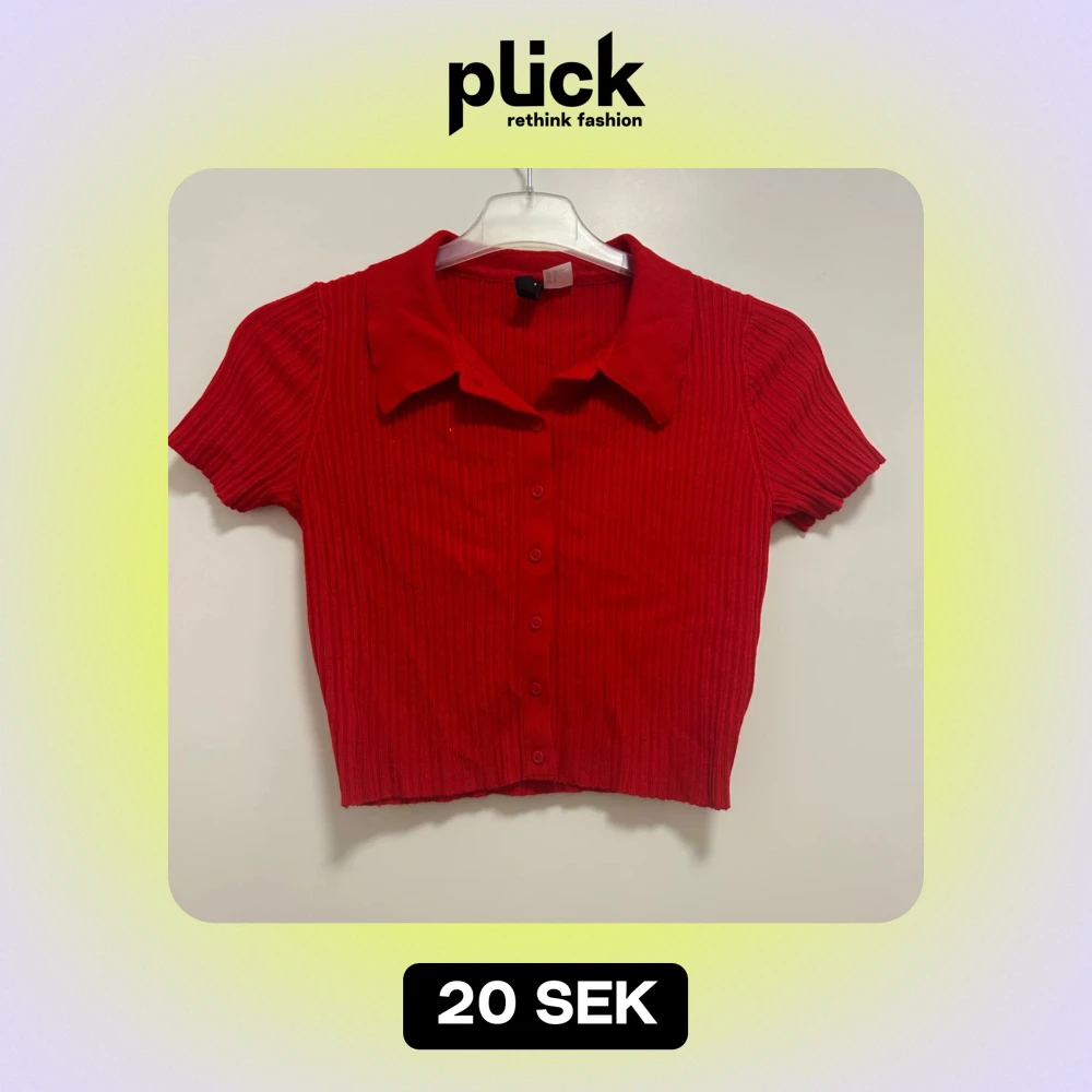 En röd, ribbad topp med en fin krage. Den är lång som en vanlig t-shirt men har en snyggare finess. Materialet är väldigt skönt och mjukt.