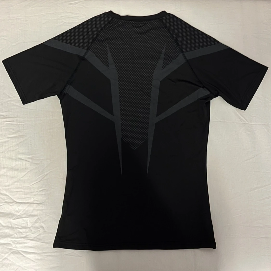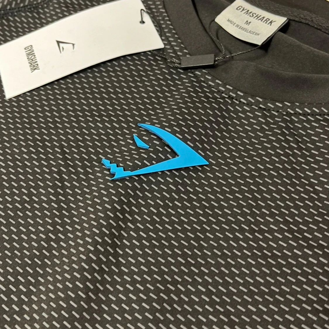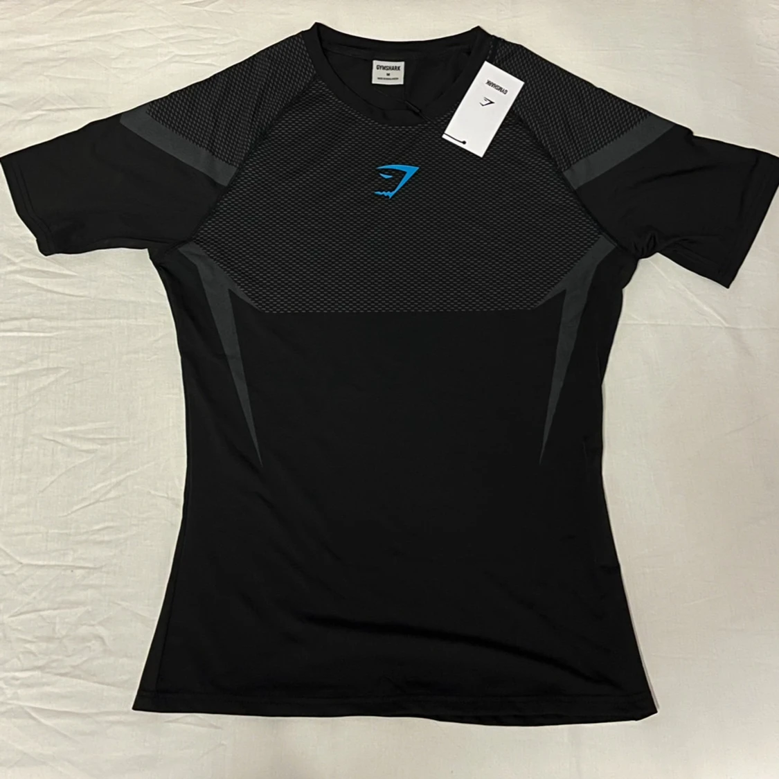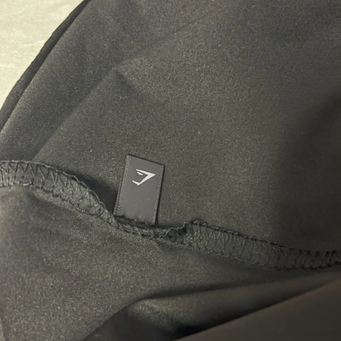 Svart t-shirt från Gymshark med korta ärmar och sportig passform. Framsidan har ett diskret mönster och en blå Gymshark-logga på bröstet. Materialet är lätt och stretchigt, perfekt för träning. Ett till ett. Snygga grå detaljer på axlar och rygg för extra stil. Denna tröja är limited edition, alltså går det inte att få tag på. Vid någora funderingar är det att bara att fråga 🤗.