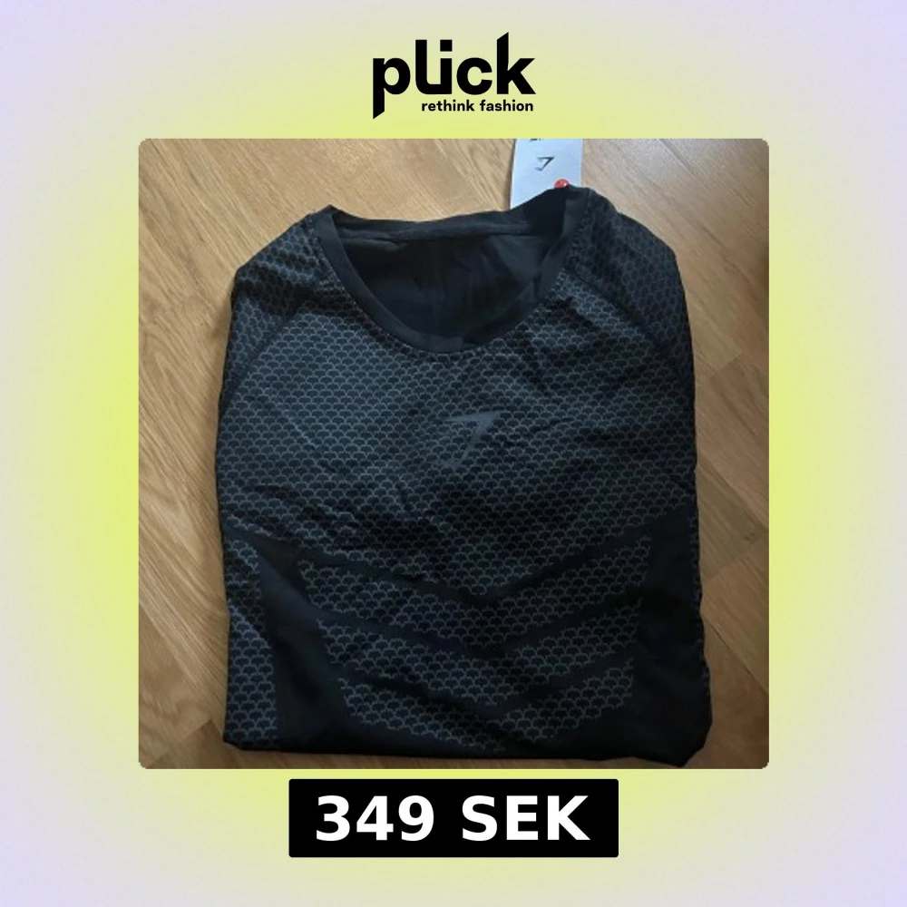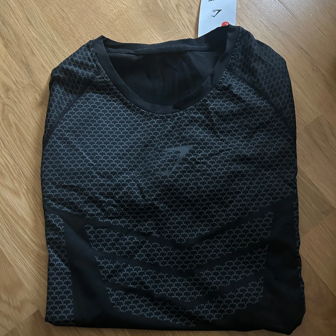 Snygg svart t-shirt från Gymshark med diskret mönster och logga på bröstet. Perfekt för träning med sitt lätta och stretchiga material. Klassisk rund halsringning och korta ärmar för en sportig look.