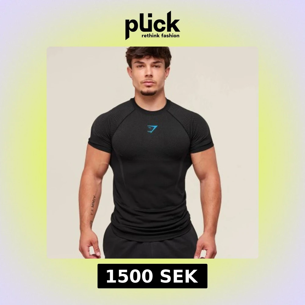 Svart t-shirt från Gymshark med blå logga på bröstet. Modellen är tight och har korta ärmar samt sportig meshstruktur upptill. Perfekt för dig som gillar att träna och vill ha en snygg och funktionell look.