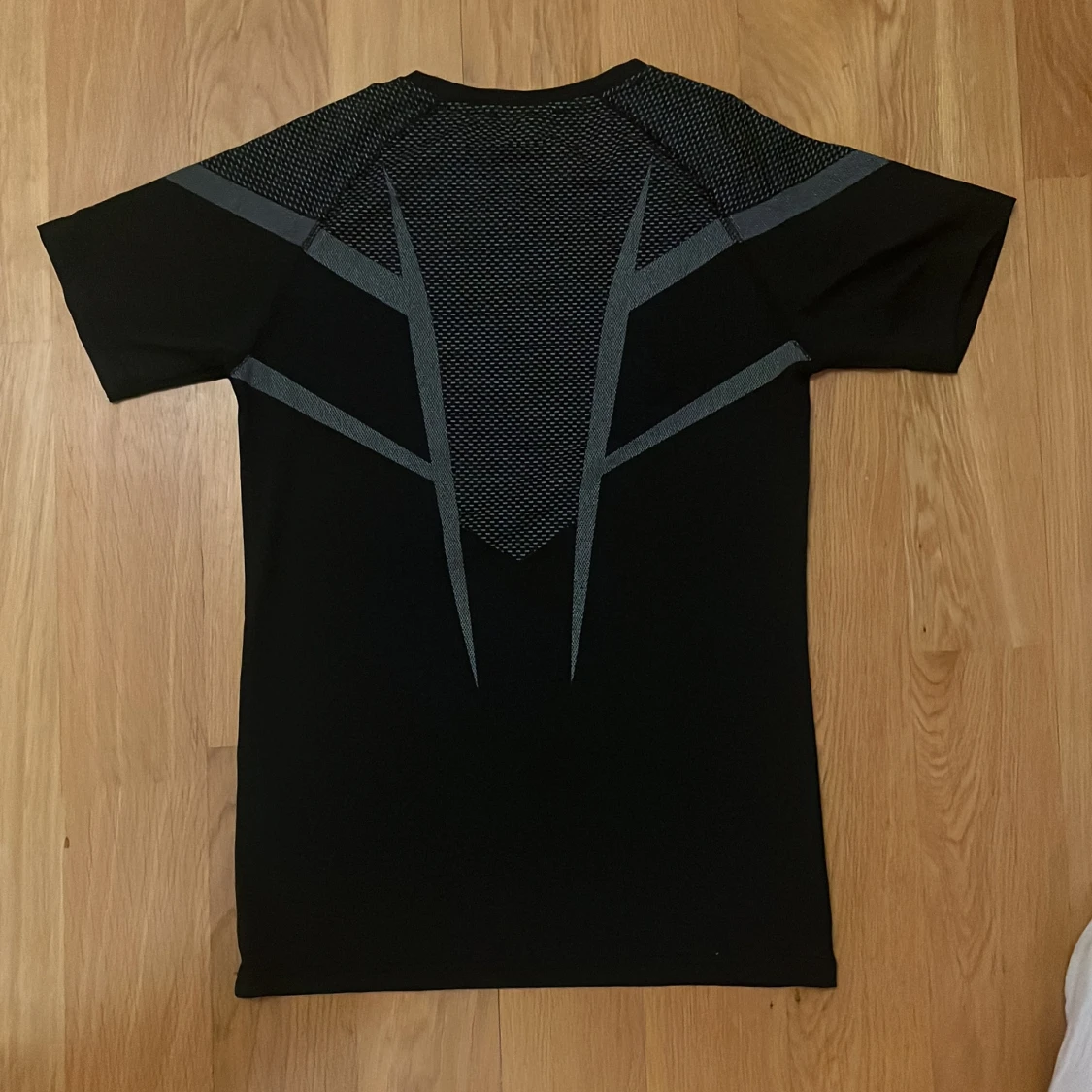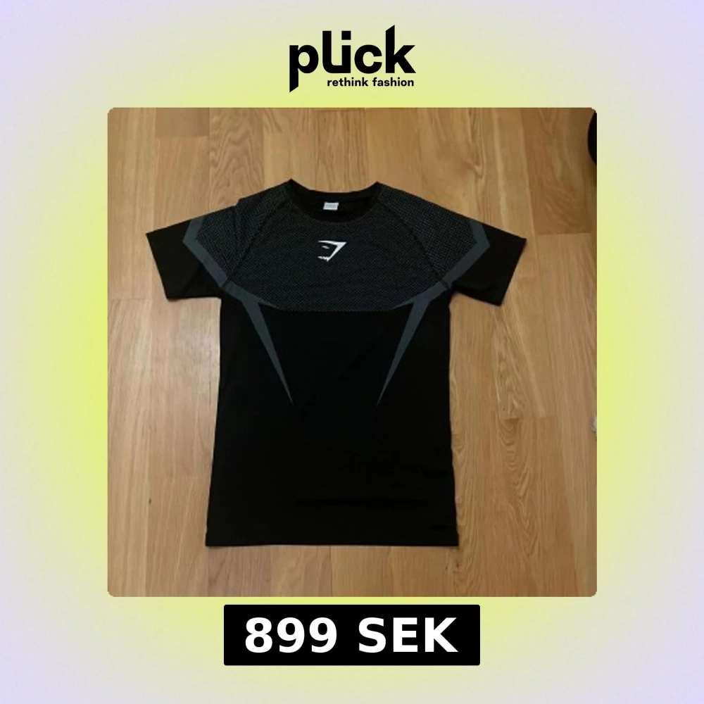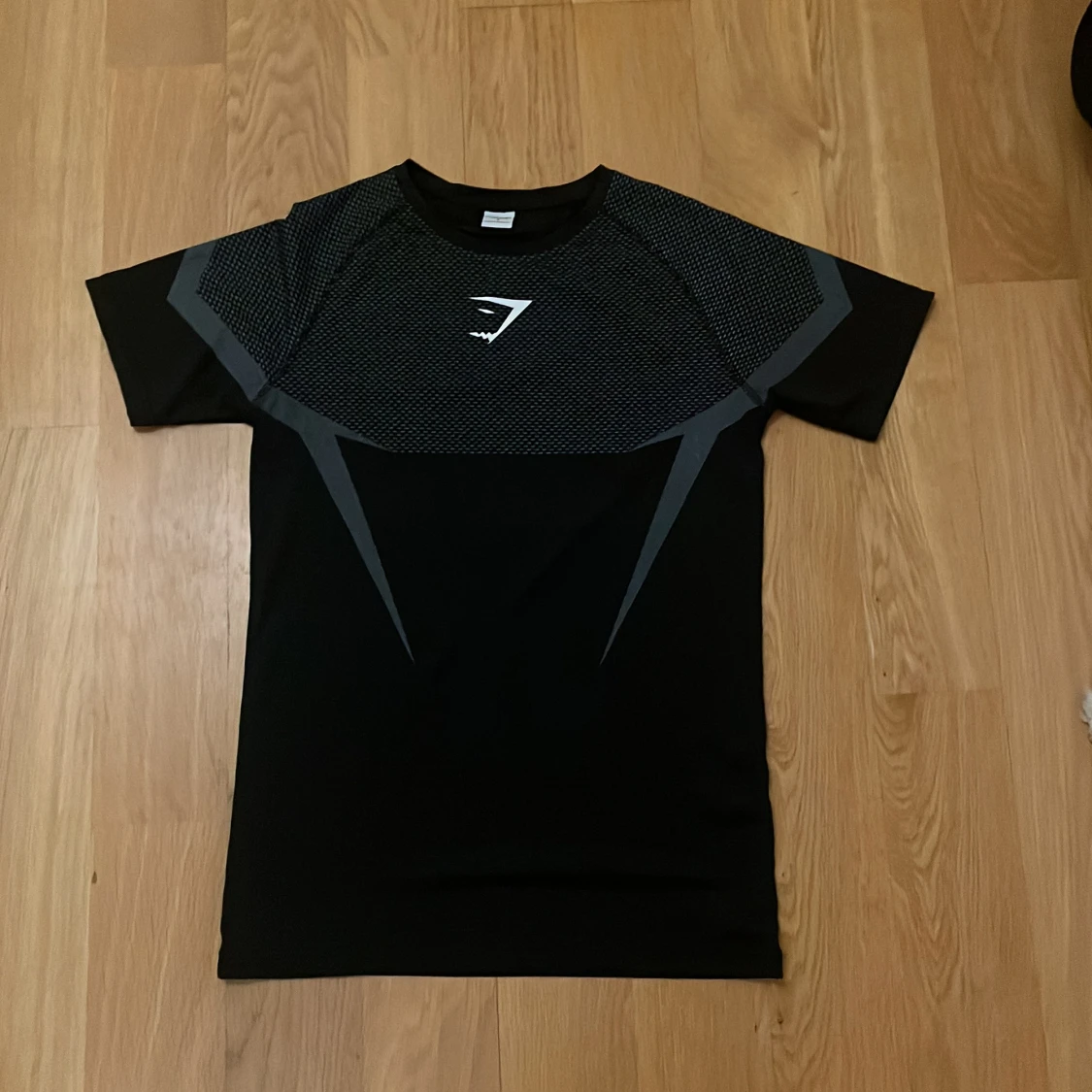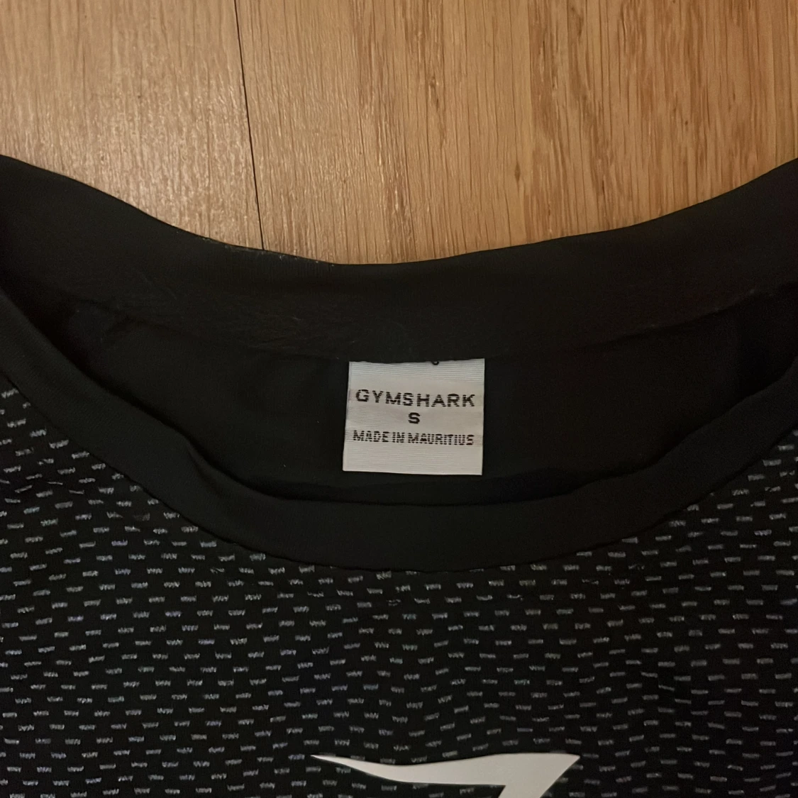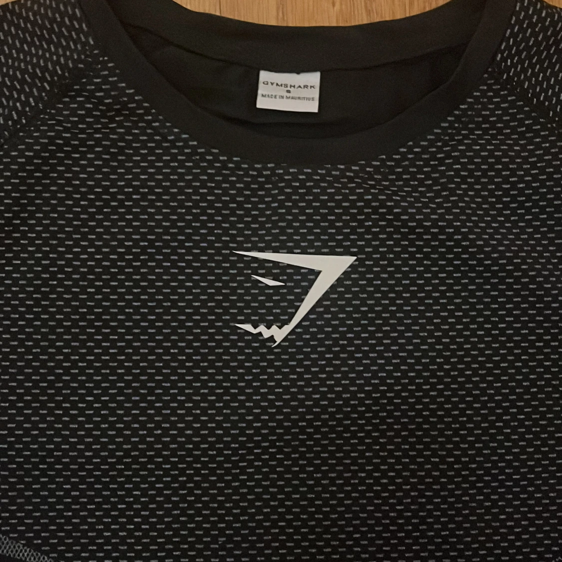 Snygg svart t-shirt från Gymshark i storlek S. Tröjan har korta ärmar, grått grafiskt mönster och diskret logga på bröstet. Tillverkad i ett stretchigt syntetmaterial som andas, perfekt för träning och aktiva dagar.