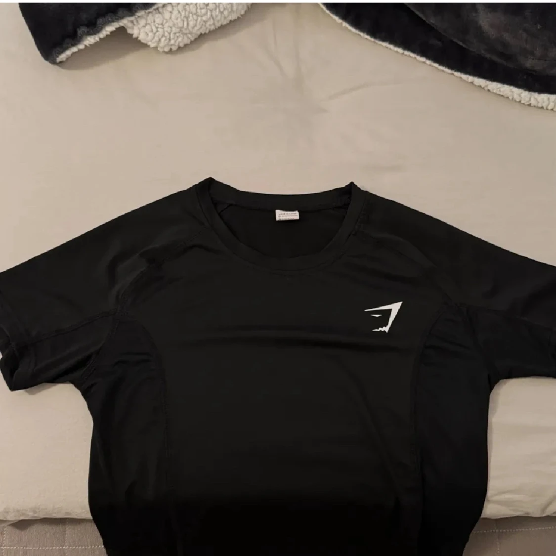 Svart t-shirt från Gymshark med vit logga på bröstet. Tight passform som framhäver musklerna, perfekt för gymmet. med korta ärmar och rund halsringning.