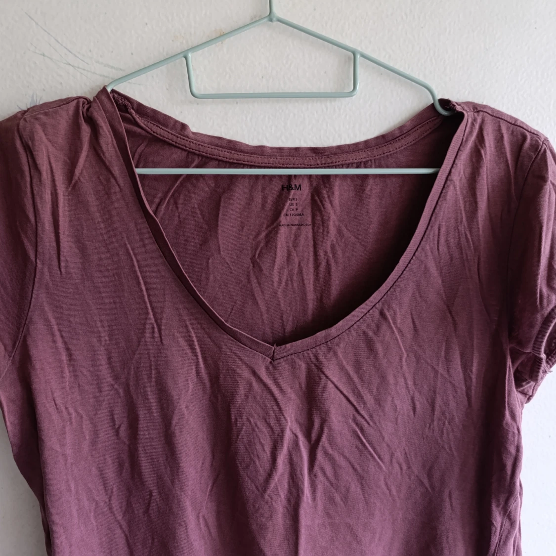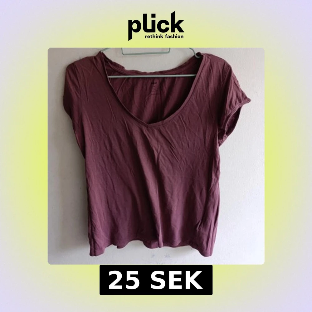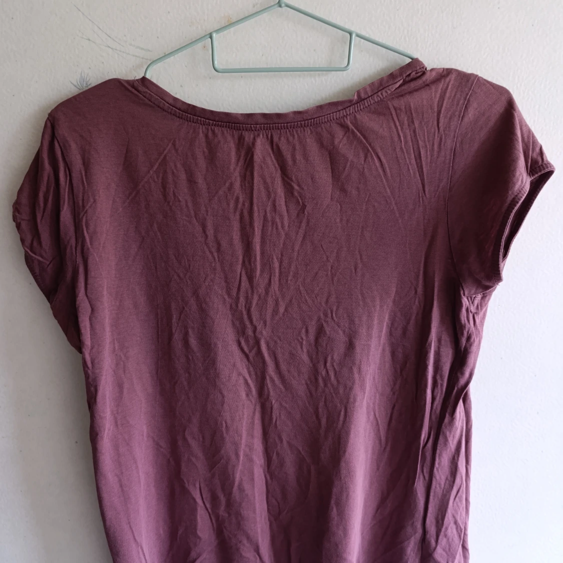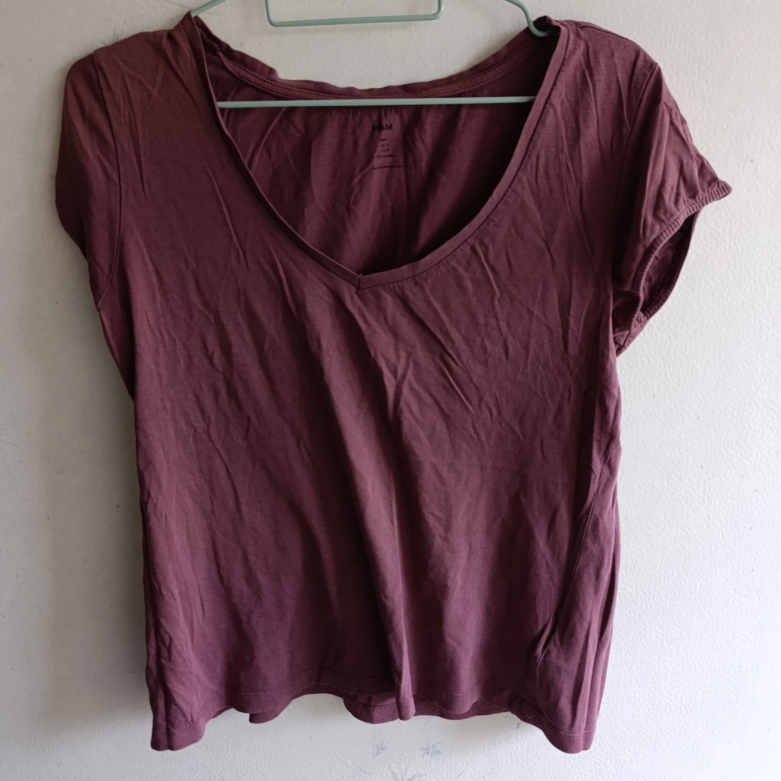 Enkel vinröd t-shirt från H&M med v-ringad hals och korta ärmar. Modellen är rak och har en avslappnad passform, perfekt till jeans eller kjol. Tillverkad i mjuk bomull som känns skön mot huden.